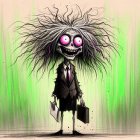 Prompt: Interview with a Zombie ~ A scary cartoon zombie ~ Paul Klee James Jean Anton Pieck Erik Johansson Charles Addams A cartoon resident is a crazed, disheveled, shaggy, old zombie with crazy hair and legs in a clown suit, crazy hair counting on flesh. Caricature. Like a child's drawing. Minimalism, simplicity, charcoal drawing, whirlwind of colors, blue and pink soot, sketching, bleached background, grunge, alcohol ink, play of light and shadow, quick sketch, unusual horror, watercolor, dark art