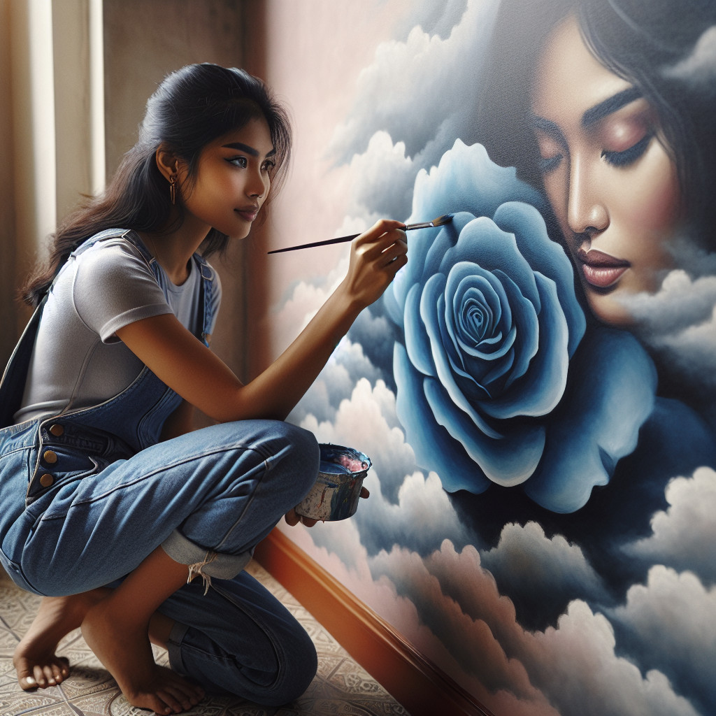 Prompt: An ethereal young female figure, composed of luminous cloud-like forms, stands centered against a deep navy blue backdrop. She holds a large umbrella, her silhouette subtly defined in a darker blue beneath its canopy. Her cloud-like skirt and the umbrella's dome are intricate mosaics of fragmented shapes in white, cream, pale yellow, and light blue, creating a shimmering, mother-of-pearl effect. Delicate white lines delineate the umbrella's structure and hang like threads from the canopy and skirt, terminating in teardrop shapes. Her legs and heeled boots emerge from the cloud mass with complex, textured fill. Several stylized white doves in flight, depicted as clean silhouettes, surround her. The textured artwork features gestural brushstrokes and multi-layered tones, mimicking abstract realism and expressionism. Diffused, low-key lighting creates a cool, mysterious shade, with glow-in-the-dark elements adding to the dark theme. Style of abstract expressionism, influenced by Cy Twombly and Anselm Kiefer.
