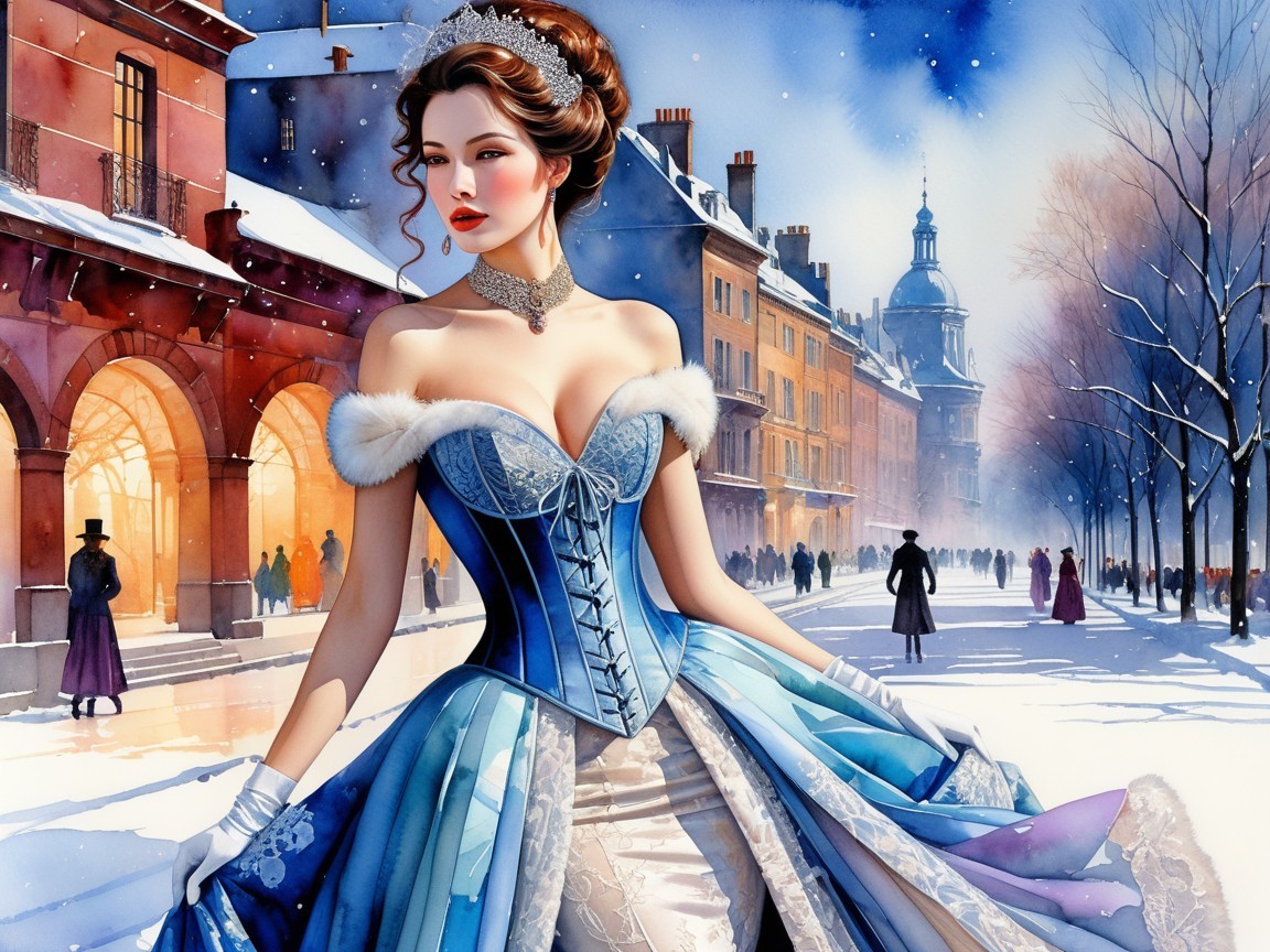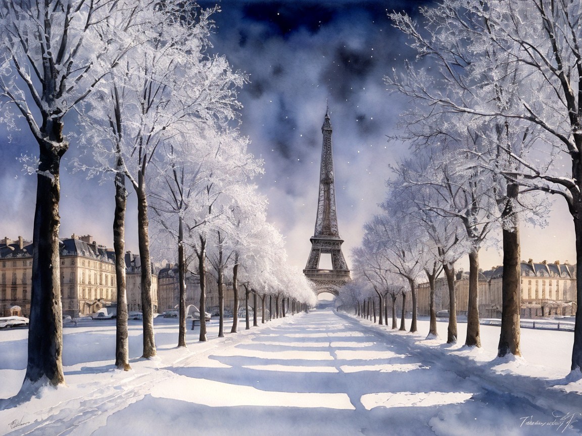 Prompt: Create an artistic illustration of a whimsical scene featuring a slender female figure with wild, flowing hair, standing elegantly in front of the Eiffel Tower. The figure is wearing a short, flowing dress that billows out around her, suggesting movement as if the wind is catching it. She has a mysterious, undefined facial expression, embodying an ethereal quality. The background is softly washed with a light blue tone, with splashes of darker blue and black ink that create a dreamy, abstract atmosphere. The Eiffel Tower is depicted in a sketchy style, merging seamlessly with the splatters and strokes that fill the scene. The figure's legs are long and shapely, and she stands confidently in chunky, stylish boots. The overall composition conveys a sense of freedom and artistic flair, with fluid lines and a mix of dark and light contrasts that emphasise the whimsical nature of the artwork.