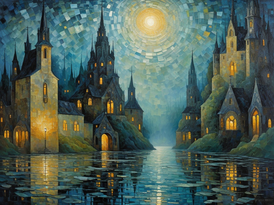 Prompt: Grunge textured abstract impasto landscape, mixed media painting with dripping paint, fantastical otherworldly spooky and gothic style landscape with rolling hills, a small forest of old twisted trees, brown and metallic, scattered on the landscape. Revival, iridescent metallic colours, silver lines, style Klee, Amanda Clarke, Andy Kehoe, Feininger, Klimt. Dramatic sky with shiny metallic stormy clouds. with mercury glass patina, vibrant iridescent colours, abstract surrealism, Metallic colours. Abstract impasto metallic style scenary, Old Victorian house is dark colored with some orange glowing windows, old twisted haunted trees surround the house. Iridescent patchwork patterns on the hills. Surreal, wide scene, panoramic. Special thanks to Smart999 and Susanne, for the modified prompt ! :)