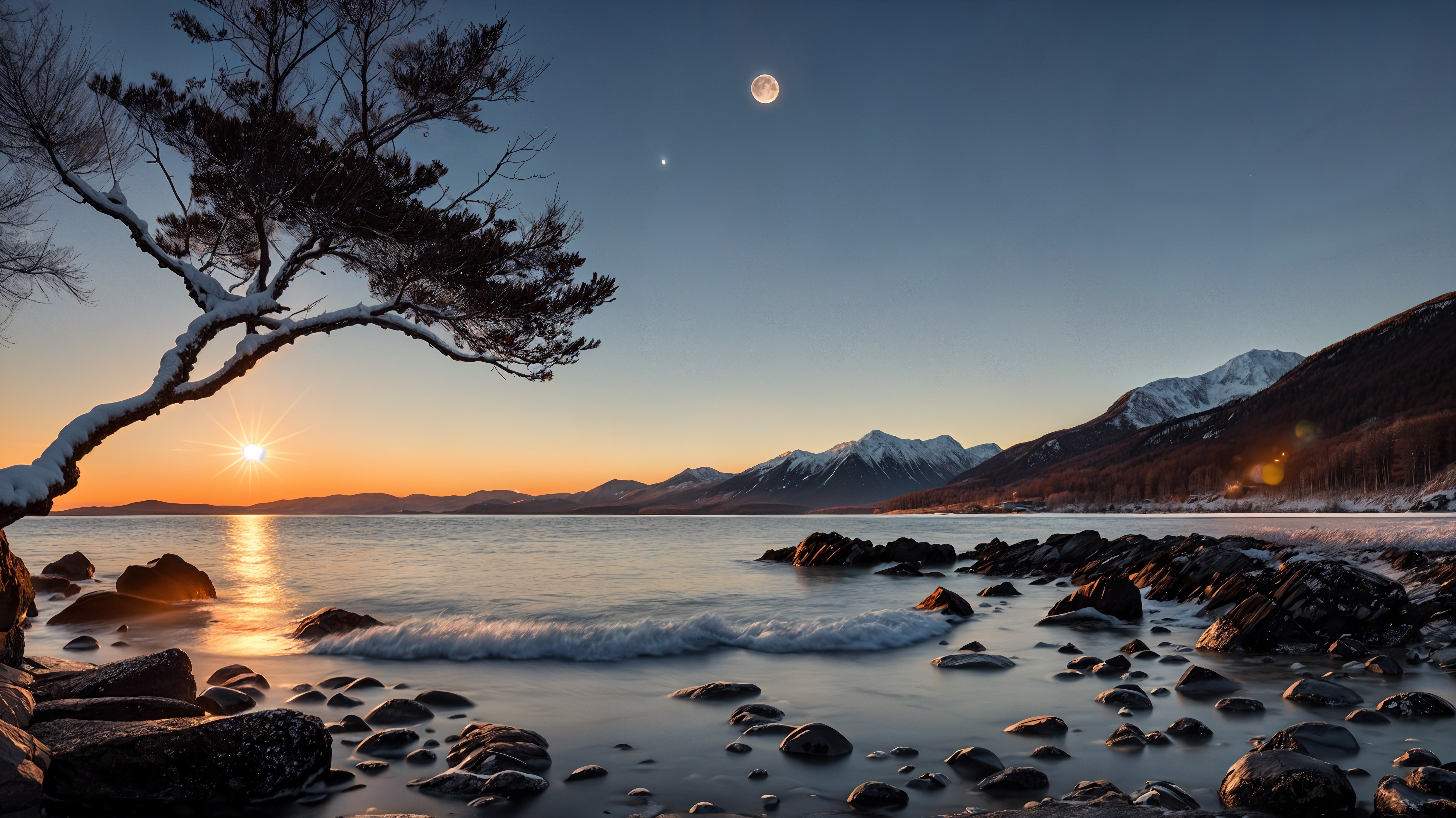 Prompt: Oils on canvas. Atop a snowy mountain, there is a cozy bar with the lights visible through the windows. Several snow-covered trees surround the bar. Not faraway there is a frozen waterfall cascading down the mountain.