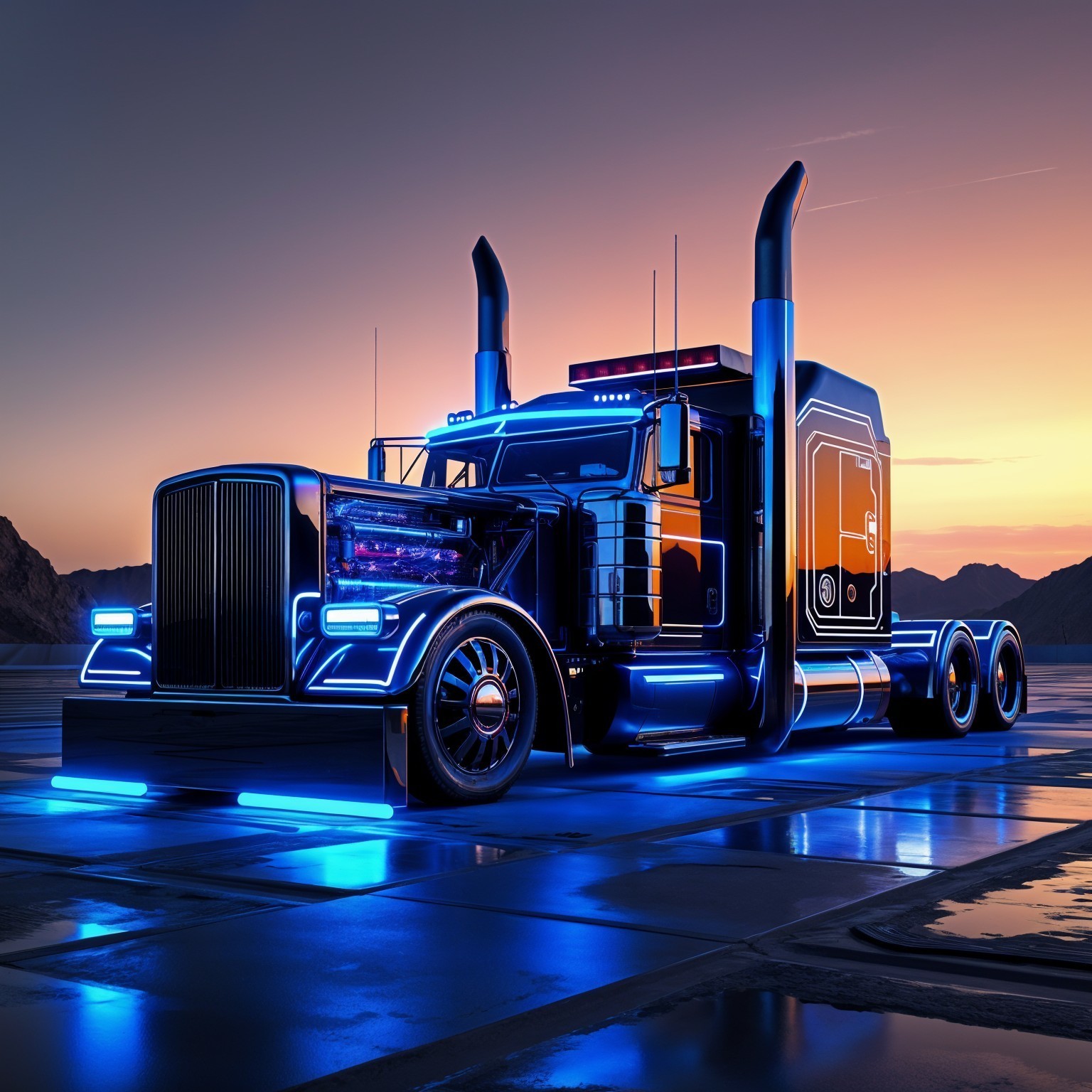 Prompt: Cyberpunk phantom big rig truck, with exposed engine, lowered down with wide wheels, lots of chrome, in huges of black, blue's and neon colors, strong branding