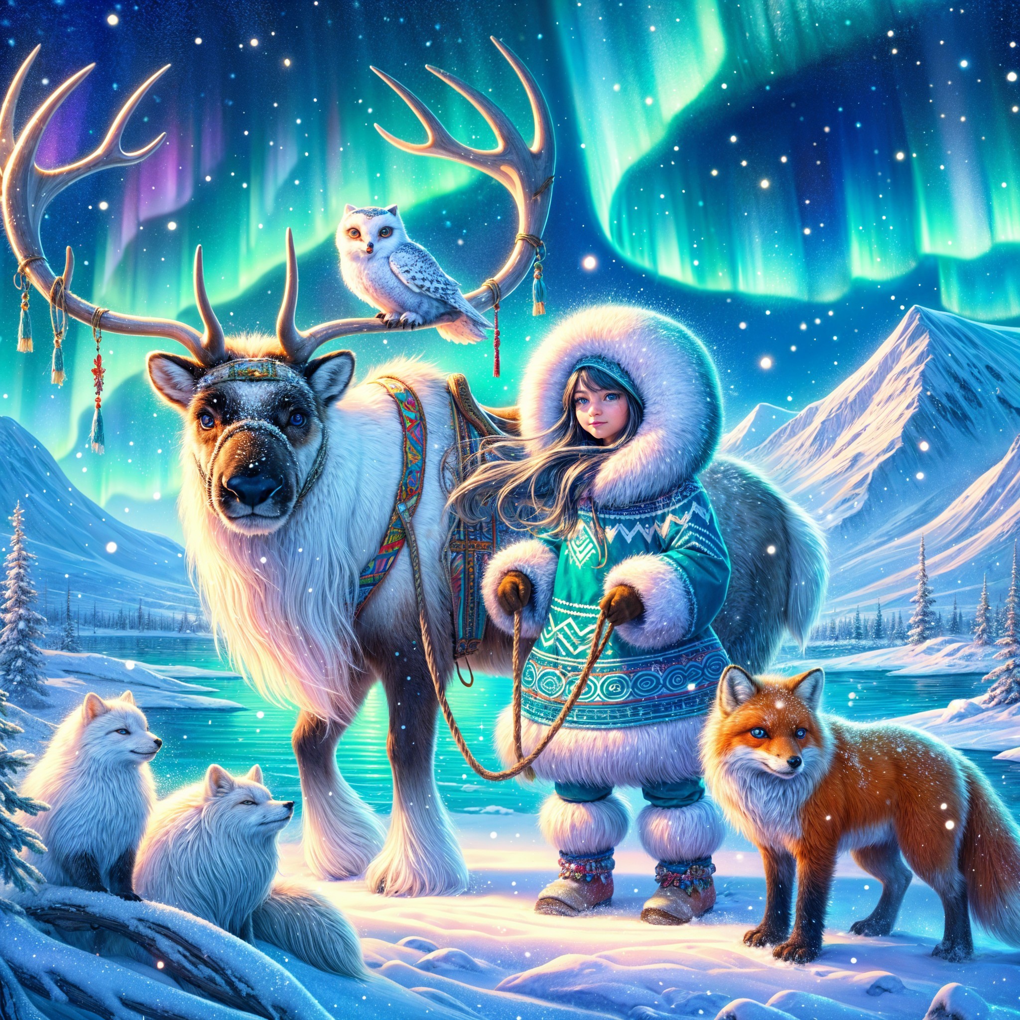 Prompt: Snow-covered winter wonderland, cozy Christmas atmosphere, charming curly red-haired girl, joyful expression, ringing a golden bell with a red bow, intricate patterned coat with toggles, stylish brown lace-up boots, pastel color palette, blurred background enhancing focus, artistic style reminiscent of Kimt, soft and dreamy ambiance, detailed snowy landscape, magical holiday vibes, warm and inviting setting, festive spirit, high-quality digital illustration.