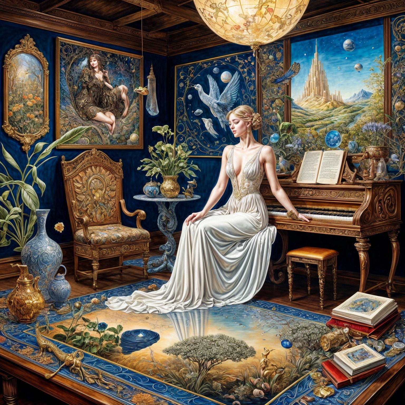 Prompt: A surreal painterly scene set along a strange, weather-worn shoreline where, in the distance, the hull of an old wooden wrecked ship rests partially embedded in the land. The ocean pours forward in a continuous surge that spills across cracked soil, as though the tide itself has been redirected from its natural path. Within the translucent segments of the terrain, a silver river winds through shifting inner realms, revealing glimpses of soft misty forest light and shallow glowing water, each layer suggesting hidden depth beneath the surface. Along one side of the scene, the remains of a finely crafted ship lean beside an ancient oak tree, its fractured structure subtly mirrored across the aged and weathered surfaces surrounding it. Thick roots coil around the lower shell of the hull, binding it securely to the ground as if nature has claimed and preserved it over time. The composition carries the tonal discipline of the old masters, supported by a warm inner radiance that gently illuminates the central forms. A quiet, desaturated background reinforces the scene’s sense of stillness, while the overall visual language includes stylistic influences reminiscent of renowned surreal and painterly artists, emphasizing depth, texture, and refined atmospheric detail.