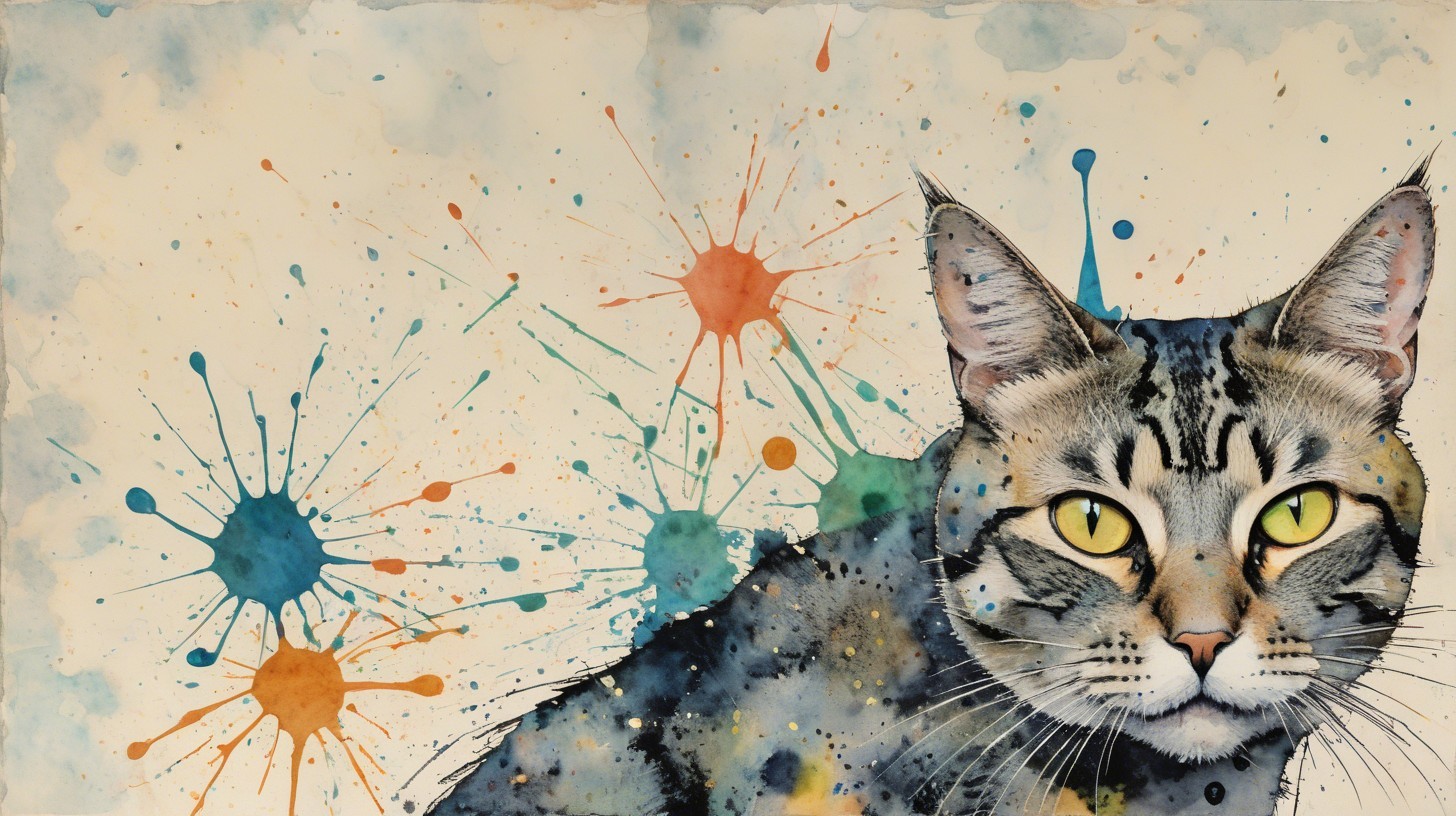 Prompt: Vibrant sketch and charcoal, shiny metallic effect watercolor, white edges, egy szürke kőből faragott cuki macskalány nyugodtan ül egy irodában, a számítógépen dolgozik, egy kopasz alacsony svéd típusú és egy barna, ciprusi típusú férfi gonosz arcot vágva gúnyolja őt, in sunshine