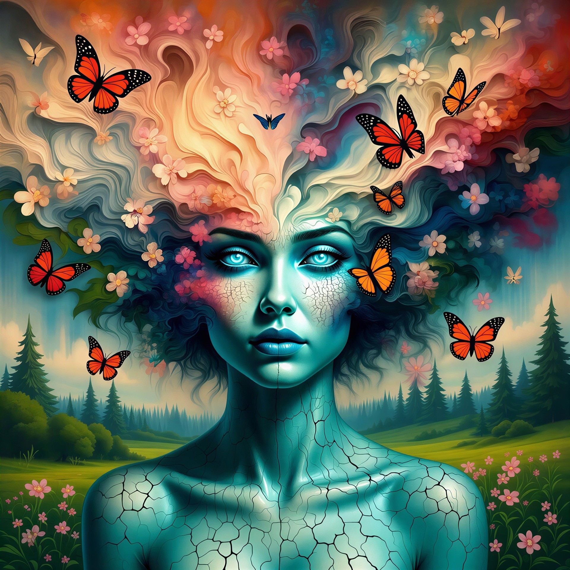 Prompt: A surreal portrait of a human face with intricate details, featuring a cracked surface revealing vibrant orange and textured layers underneath. Surrounding the face are a variety of colorful butterflies in shades of blue and orange, flying and perched, creating a dreamlike atmosphere. The background is a subtle gradient that enhances the contrast between the face, the butterflies, and the textured elements, emphasizing themes of transformation and beauty in decay.