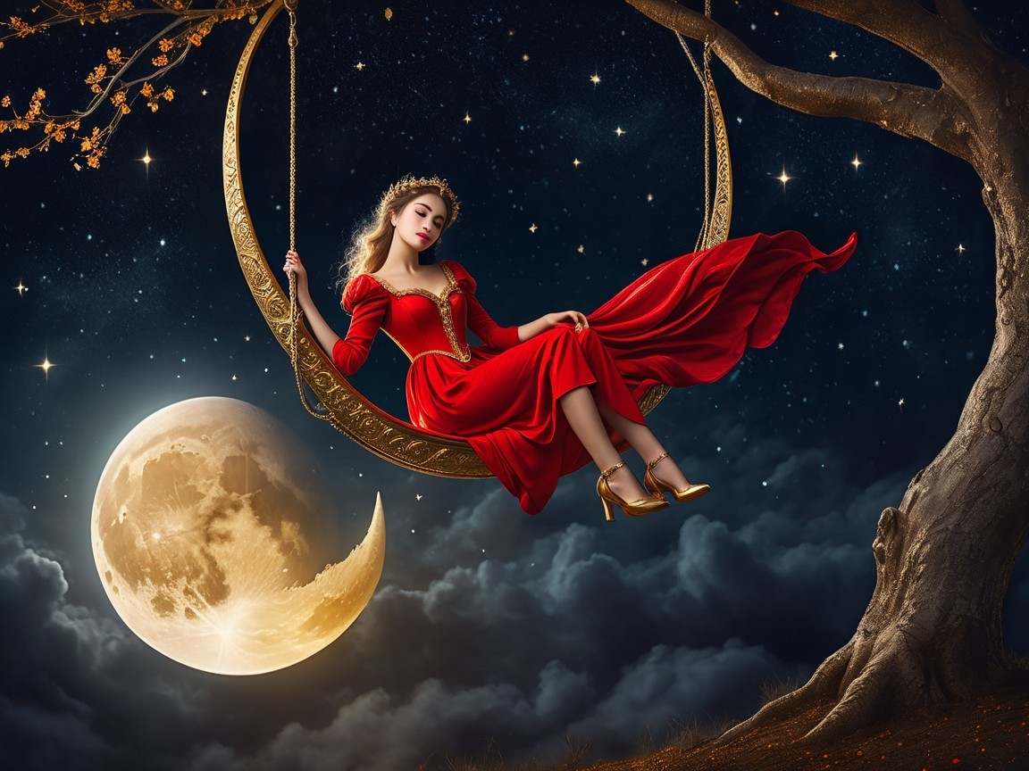 Prompt: Hyperrealistische illustration serene woman with long dark hair and deep brown eyes wearing a flowing white dress with a christmas tree digtal gecreëerd lee bogle satin shiny smootskin