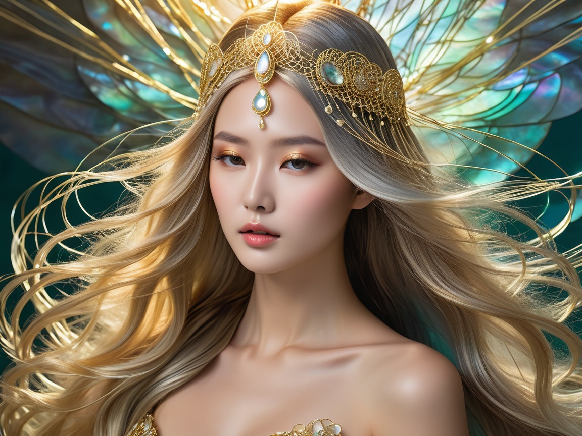 Prompt: A minimalist, abstract portrait in profile of a serene 40 year old balinese woman. Her face is softly rendered with closed eyes, blending seamlessly into long, wavy hair that flows in the wind. The hair features a spectrum of subtle, iridescent or pearlescent colors – hints of blue, pink, and silver – appearing as textured, individual strands. The overall composition is clean and elegant on a solid black background, with a focus on smooth lines and ethereal glow. Digital painting, high contrast