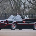 Prompt: 1966 Batmobile, Perfect, made from a1955 Ford Lincoln Futura concept car, 429 Ford Race engine, batman face front, scoop nose, headlights as eyes, grille is the mouth, 84 inch rear fins, black glossy paint, glossy red paint accents, park face front, at a angle, sandy dirt road, background fall trees, Perfect, 32K resolution