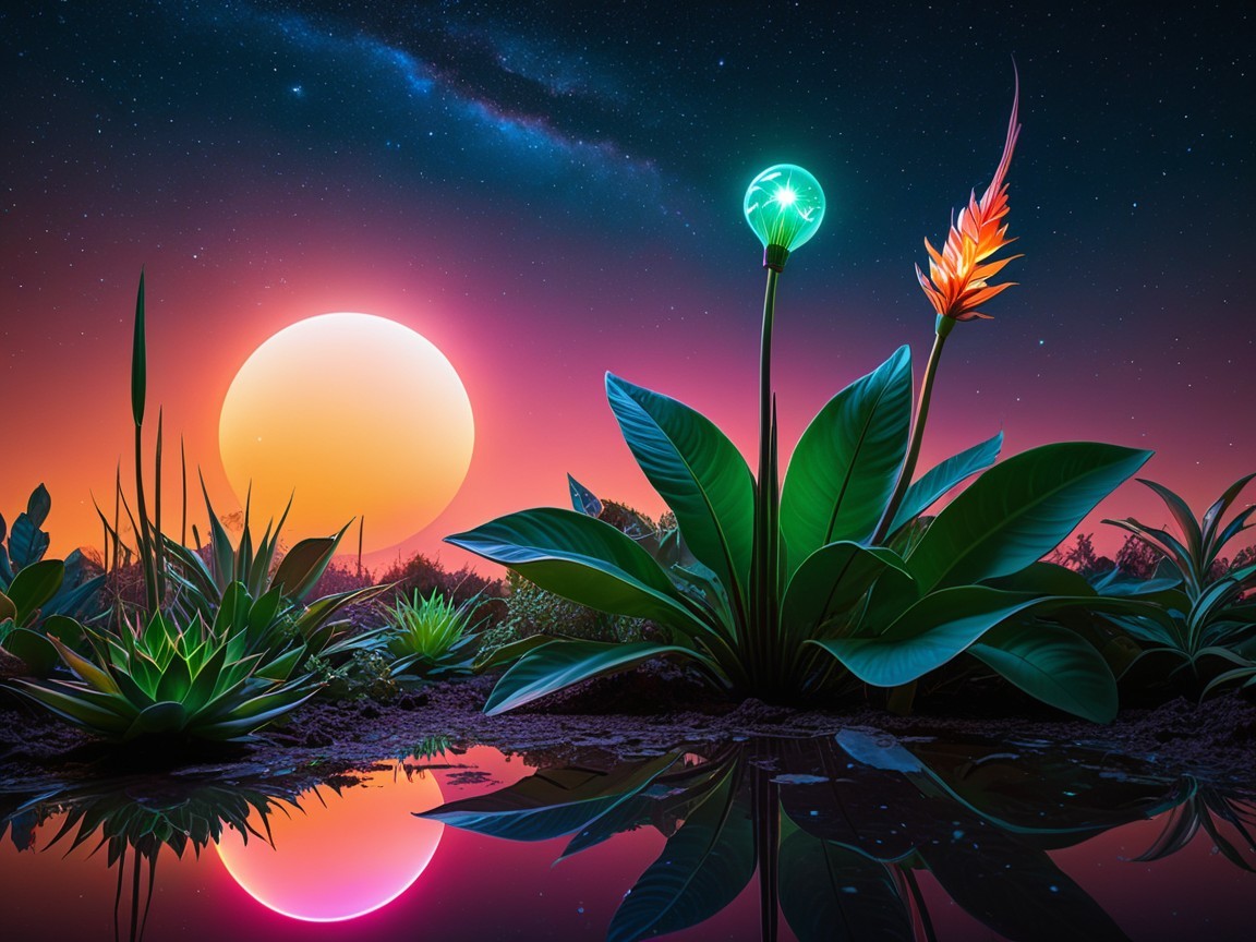 Prompt: A surreal low-angle scene under a starry sky, where a smooth reflective surface glows with neon and pastel tones. In the foreground, a fantastical plant with elongated leaves and an intricate bulb rises from the ground. A radiant sun hovers above, casting rich burgundies, emeralds, dark oranges, and soft blues in a mesmerizing color interplay. The partially blurred background enhances the dreamlike, high-definition fantasy—blending Van Gogh mysticism with surrealism.
