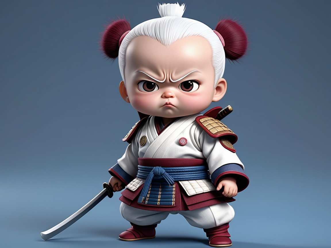 Prompt: Cute angry baby samurai character by Bottero and Hayao Miyazaki and Tim Burton, kawaii in white and burgundy blue by wes anderson, full body image, dynamic pose, sakura texture