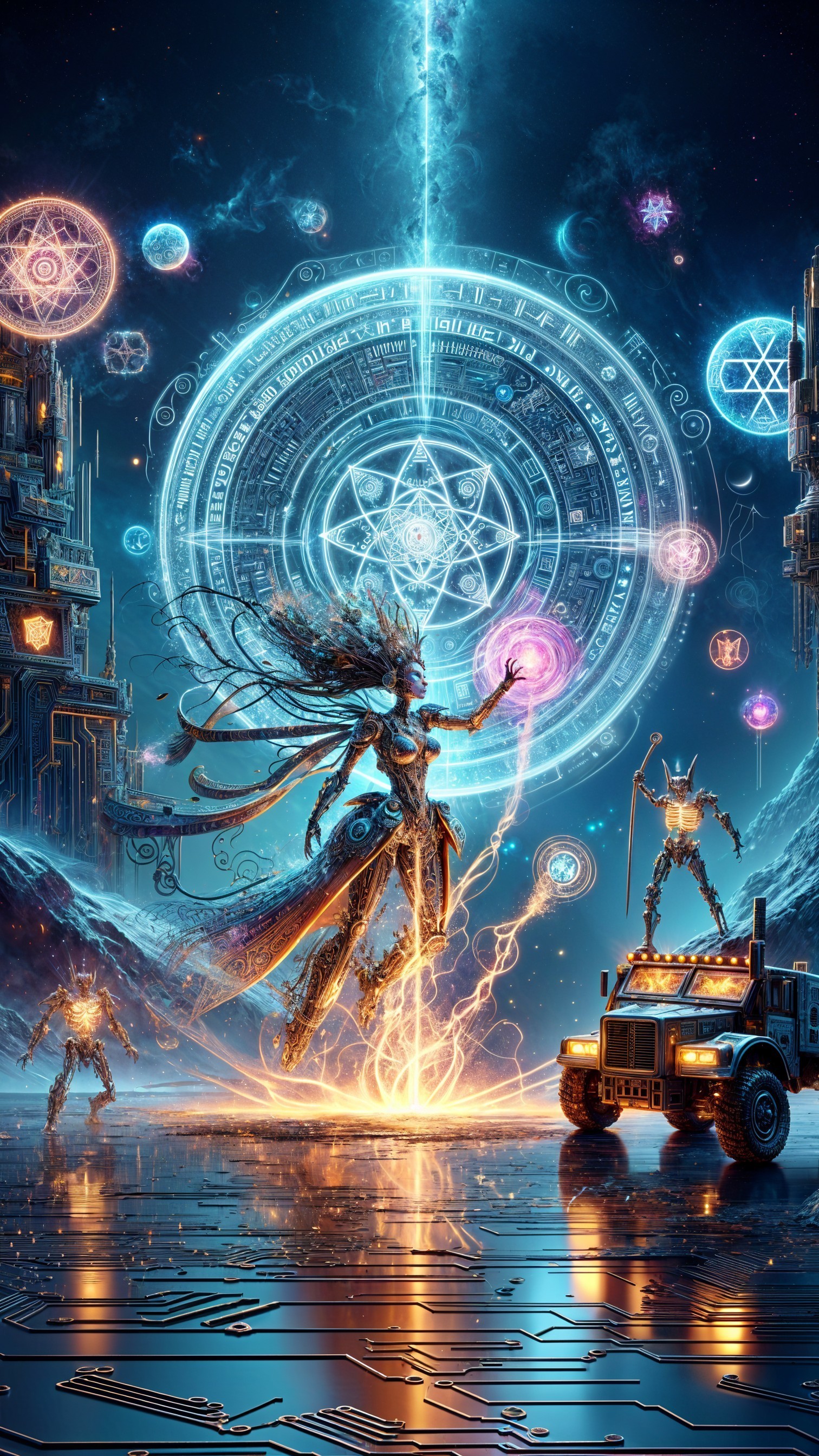 Prompt: Create a vibrant and whimsical scene featuring a large, glowing candle at the center, surrounded by a plethora of colorful and fantastical elements. Include swirling clouds, playful decorations like rainbow arcs, cheerful trees, and various ornaments such as shiny spheres, playful creatures, and whimsical toys. The atmosphere should be dreamy and magical, with a blend of warm, soft lighting and a starry sky backdrop, evoking a sense of celebration and wonder.
