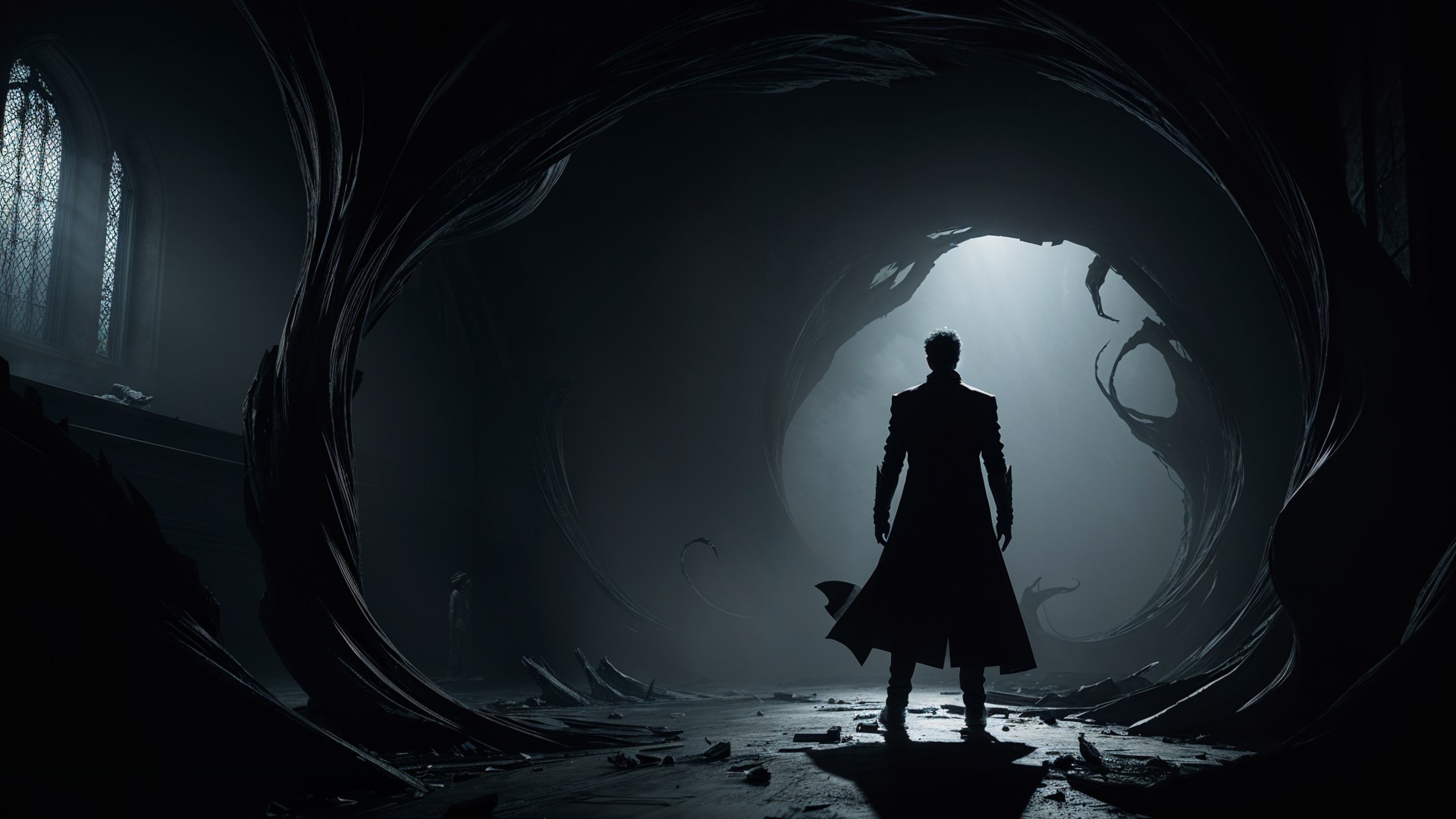 Prompt: Intriguing Jesus Christ silhouette, filled with a nocturnal red cast Biblical Jerusalem, double exposure effect, black outer silhouette, inner glowing landscape with lights, set against 3D black and grey backdrop with red curving lines, bold black strokes, white, and bright red, blending Olivia De Berardinis' sensuality, Thomas Kinkade's dramatic chiaroscuro, Greg Rutkowski's mystical aura, and Alphonse Mucha's Art Nouveau elegance.