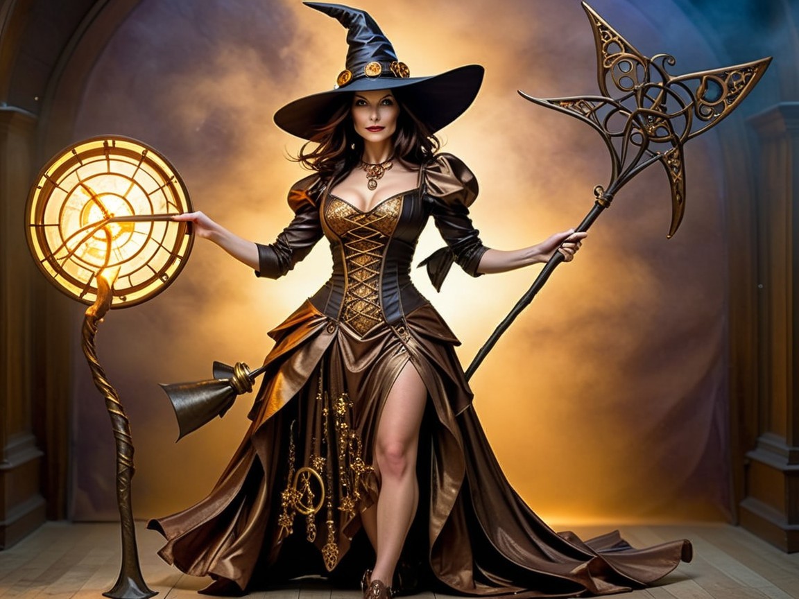 Prompt: A detailed airbrush by Alberto Vargas of two young barefoot sorceresses stand symmetrically back to back, smiling and posing playfully, their bodies pressed together in intimate confidence in occult-inspired silk bodycon sleeveless minidresses with lace flair. Their skin glistens as if oiled, reflecting the light. The redhead with flowing curls wears deep emerald green floral, lace-up side. The dark-haired woman with a high ponytail wears midnight blue adorned with crescent moons and stars, slit high to reveal her thigh and ending in a beaded fringe. Hips and thighs brush in a relaxed touch, emphasizing the sleek, flowing fit. The redhead raises her arms as glowing green vines grow from the palm of her hand, blooming with luminescent flowers , the ponytailed sorceress commands violet lightning that crackles between her fingers while dark storm clouds gather overhead. They stand on stone platform surrounded by ancient ruins, magical glyphs etched into cracked pillars..