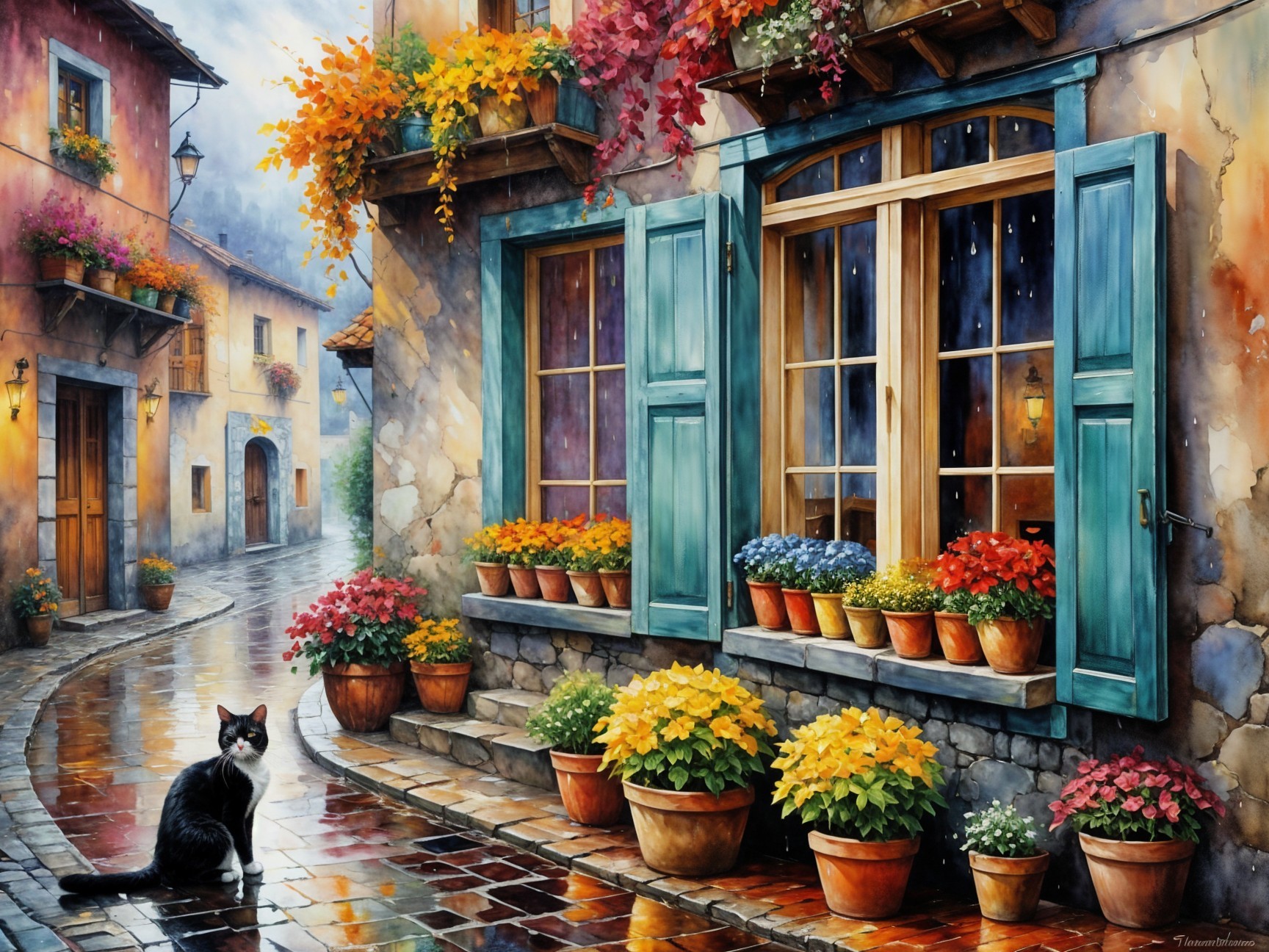 Prompt: rainy autumn street in an old Albanian village, flower pots, outdoor cafe, a cat sitting in a window, watercolor, vibrant colors, wet reflective surfaces, cobblestones.
