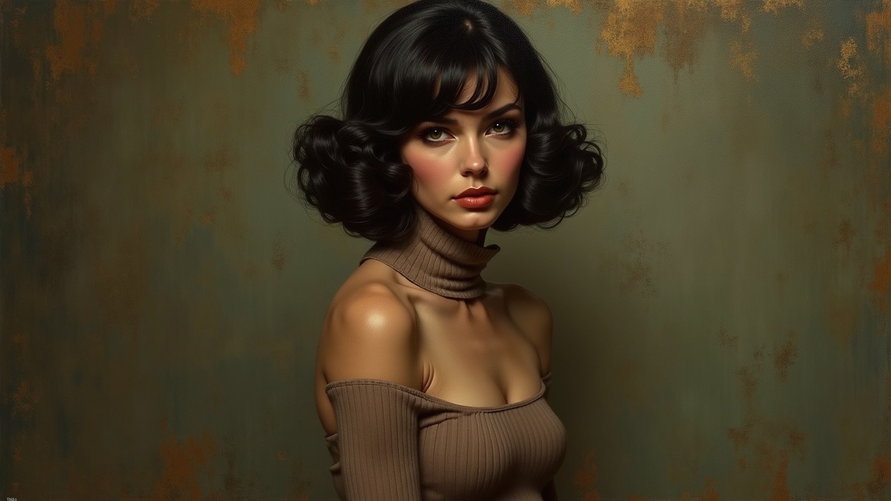 1970s a braless small busted woman, wearing a tight ribbed turtleneck sweater, 70s fashion,gorgeous beauty,féminity and grâce ,,glamour and aesthetic,in the style of Luis Gabriel Pacheco, Jean-Baptiste Monge, Harry Clarke, Agnes Cecile, Anna Sui and Richard Burlet,