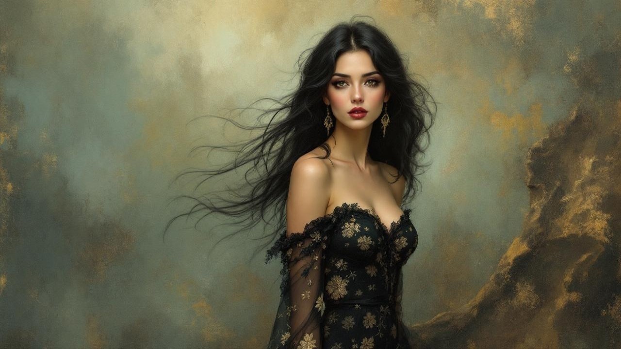 1950s raven black haired pin up woman, bold direct eye contact and expression, standing, full body,gorgeous beauty,féminity and grâce ,,glamour and aesthetic,in the style of Luis Gabriel Pacheco, Jean-Baptiste Monge, Harry Clarke, Agnes Cecile, Anna Sui and Richard Burlet,STYLE: "A fusion of Alphonse Mucha+John William Waterhouse+tonalism where subjects display idealized naturalism with soft edges against atmospheric, textured backgrounds. Harmonious color schemes emphasize a dominant hue with strategic complementary accents, employing oil painting techniques that vary between smooth blending and visible brushwork to create depth and focus while preserving the essence of the original elements."