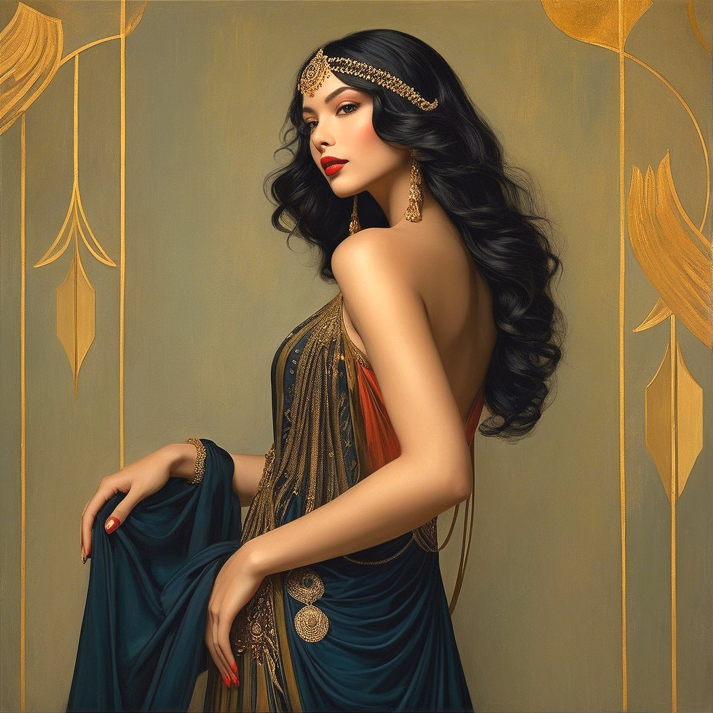 The background is a muted gold with abstract, art-deco-inspired designs, enhancing the luxurious feel of the composition. The overall atmosphere is one of sophistication and allure, with soft lighting that highlights her features and the intricate details of her clothing.