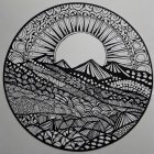Interspersed among this natural scenery are geometric symbols and patterns etched in various shades, merging into the overall design. Include an array of organic shapes like plants and intricate symbols that evoke a sense of cultural heritage.