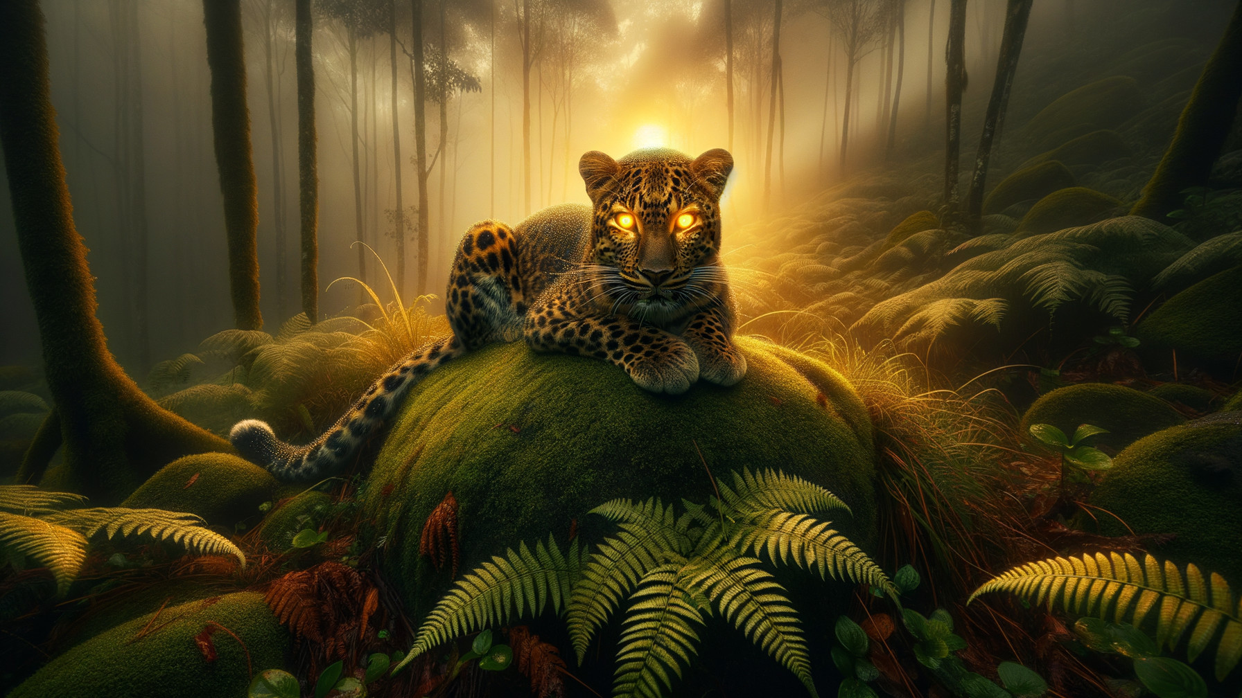 Prompt: A Sri Lankan leopard perched on a mossy rock amid misty highland forest, golden eyes glowing through drifting fog. Dew-laden ferns, soft rainlight, and spectral atmosphere.