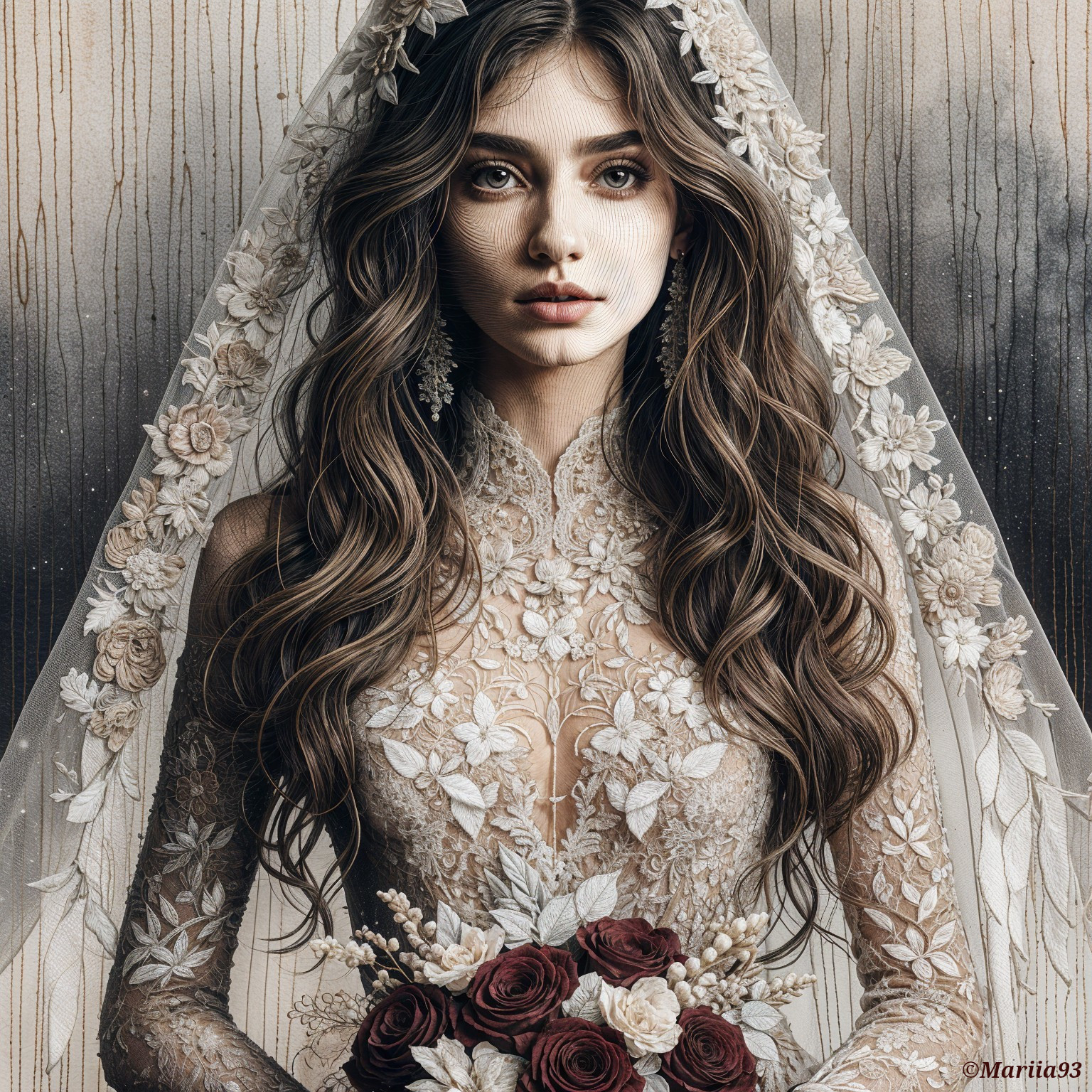 Prompt: A mixed-media picture of an enigmatic bride in a white embroidered gown, illuminated by soft, moody light. A sheer veil casts delicate shadows over her serene face, giving her an ethereal, ghostly grace. She holds a bouquet of deep red roses, their petals dark and velvety against the pale fabric. The atmosphere is mystical and romantic, with a touch of gothic melancholy — soft candlelight glow, whispers of mystery, and a timeless, haunting beauty, created in the style of Bohdan Pylypiv — combining pyrography with delicate watercolor accents. The main outlines and facial features are rendered with fine woodburned lines, rich in black, silver, white, red and beige tones. Original prompt by Mariia93