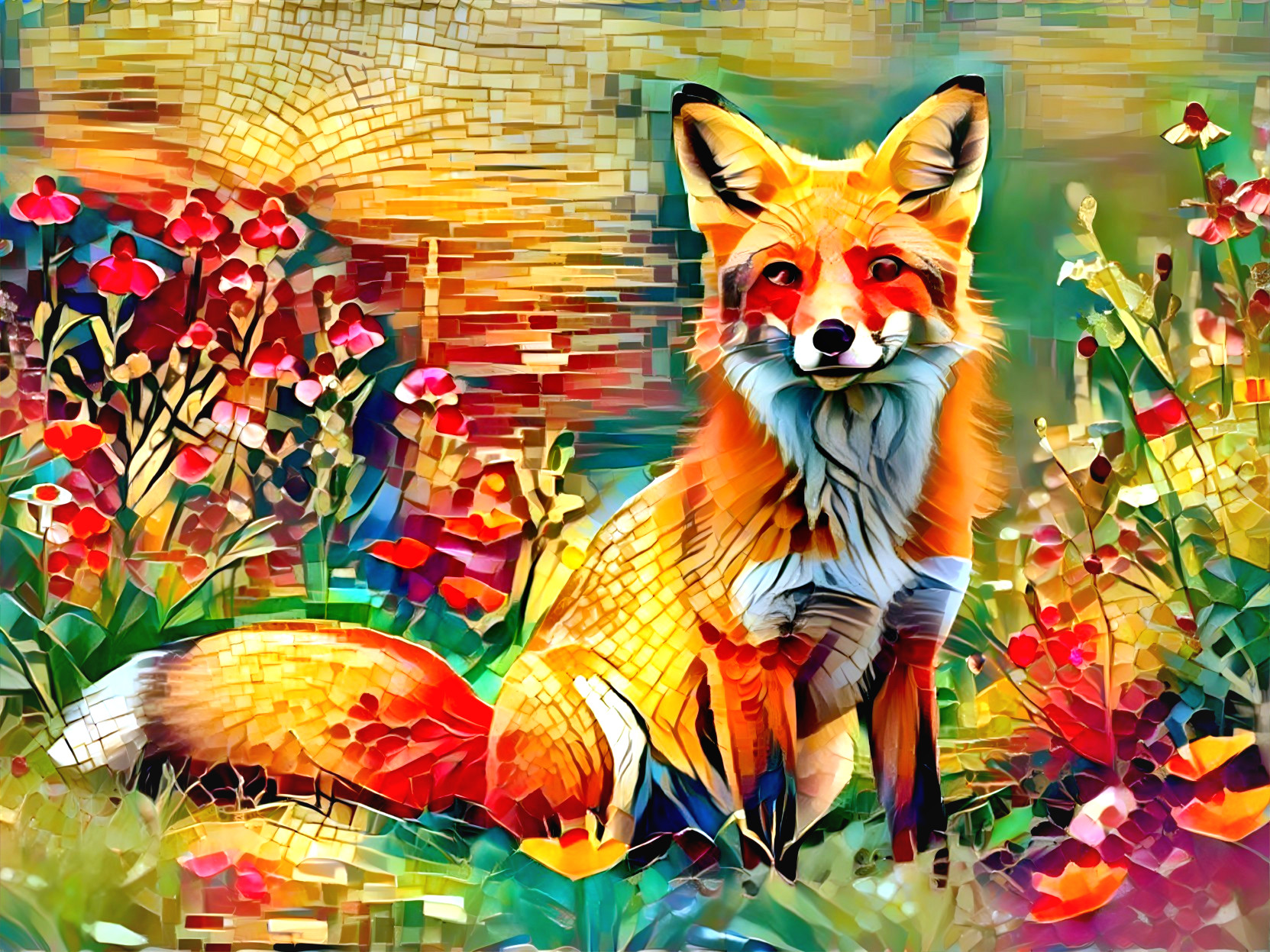 Prompt: Create a depiction of a small, scarlet fox dressed in holiday-themed pajamas, wearing a bright red Santa hat and a matching scarf. The fox is playing an electric guitar passionately next to a Christmas tree adorned with shining lights in a cozy house with a chimney. Surrounding the fox, there's an animated swirl of music notes playing out beautifully. This scene should evoke the style of Post-Impressionism, with thick, expressive brushwork, vibrant lighting, and textured paint reminiscent of the artist behind 'Cafe Terrace at Night'. The image should communicate a sense of a warm house on a chilly moonlit night.