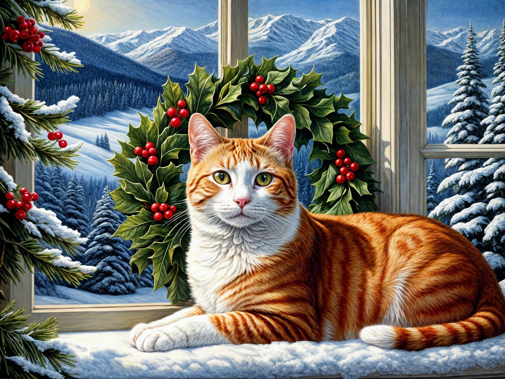 Prompt: A digital painting depicts Santa Claus and a young pretty blond woman meticulously decorating gingerbread cookies, cakes, and other desserts on an antique wooden table laden with Christmas sweets in a cozy, festive kitchen during snowfall outside a large window. Santa Claus, with a long white beard and mustache, wears a red and green velvet suit