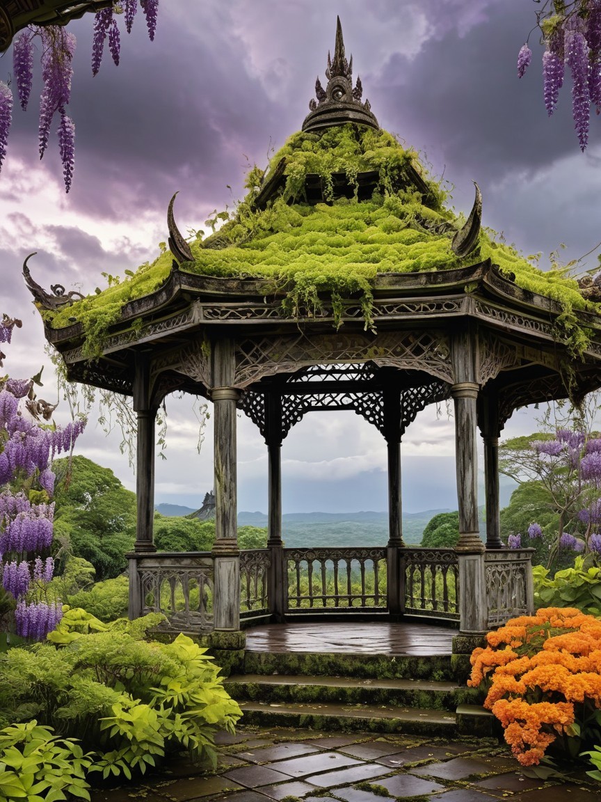 Prompt: Watercolor painting. Medium shot. An abandoned ornate Thai gazebo covered in moss and vines, purple and orange Wisteria flowers surrounded by swirling storm clouds. Highly detailed digital ink outline. Intricate Thai patterns on the gazebo roof. Lush, overgrown garden. Soft, diffused lighting. Art by Van Gogh, detailed, intricate, masterpiece, best quality, 4k, hdr, the best quality and composition, imperial colour, beautiful, dreamlike, intricate, surreal, cinematic lighting, masterpiece.