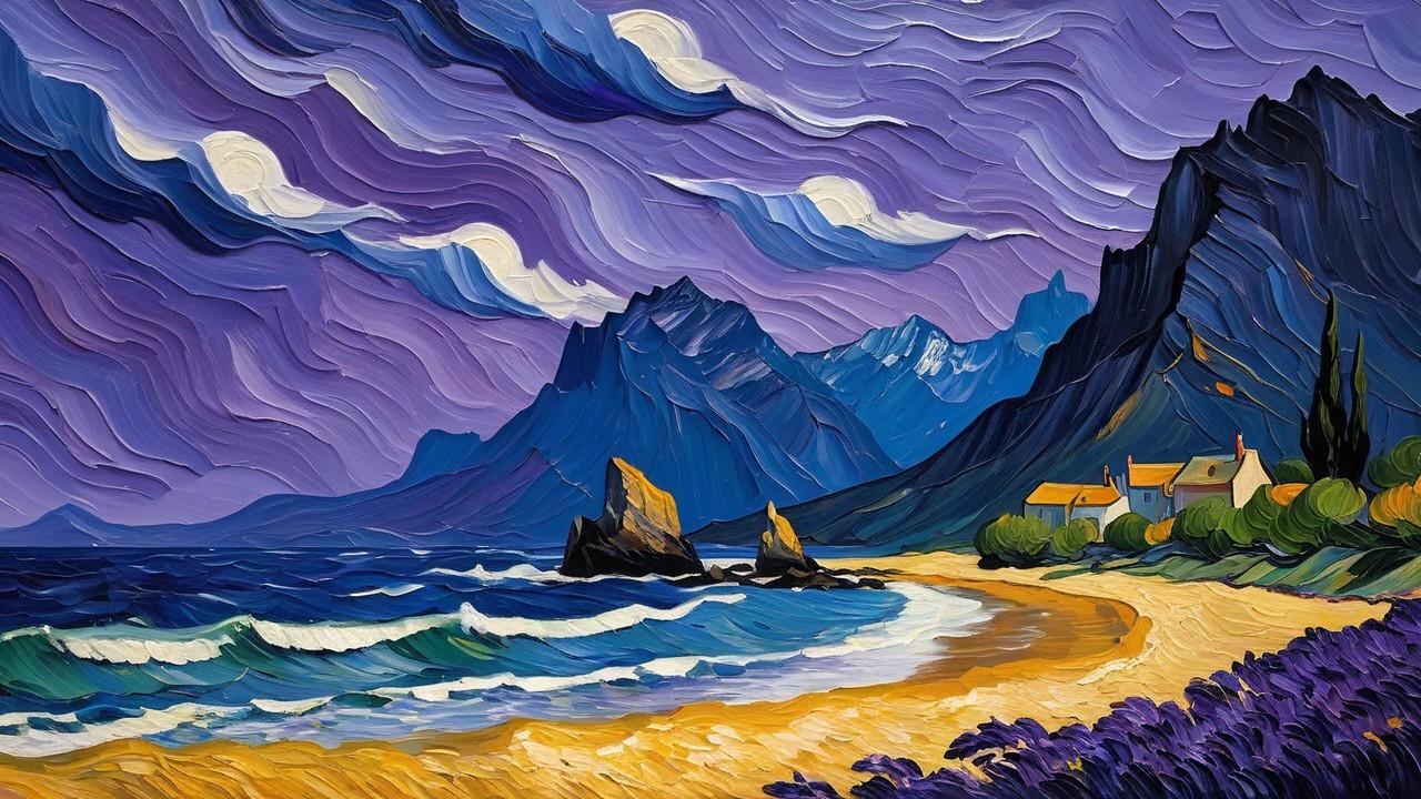 Prompt: "Cliffs surging beneath a storm of cobalt and indigo, thick impasto strokes twisting the peaks into restless motion, bursts of ochre stars scattering across violet shadows in Van Gogh’s turbulent rhythm."