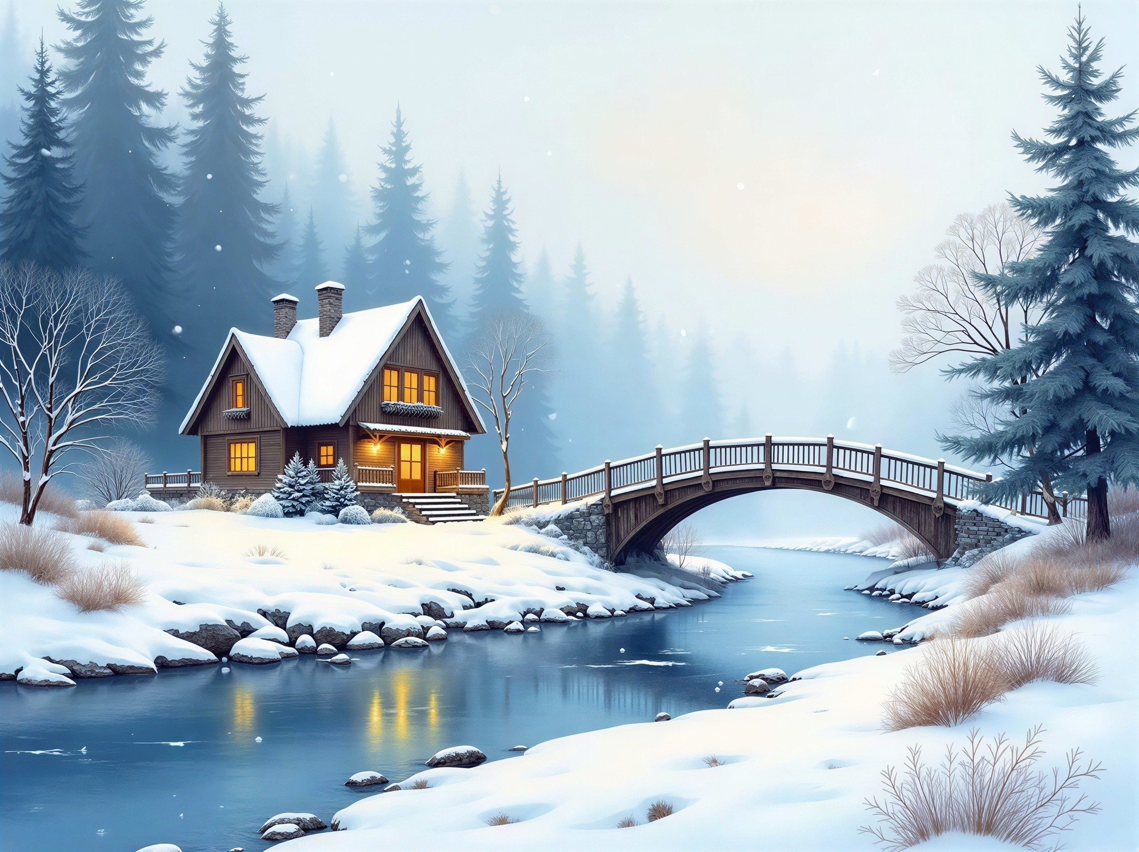 Prompt: a snowy winter landscape of a beautifully lit village with huts and a frozen river meandering through the village and a small illuminated church
