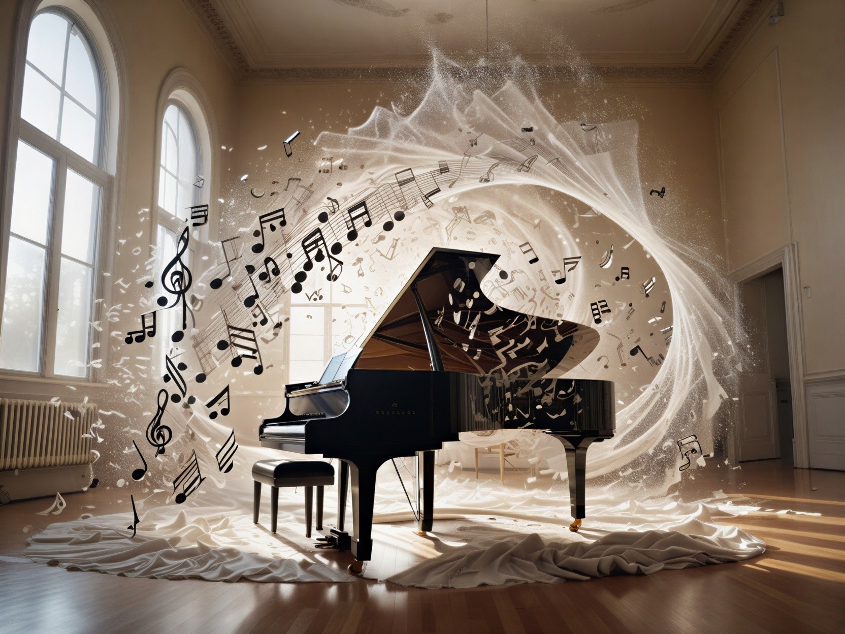 Prompt: This surreal photograph captures a musician seated at a grand piano, where the boundaries between sound and physical form dissolve into dreamlike chaos. Musical notes—rendered as delicate, animated figures—erupt from the piano’s open lid and sheet music, swirling through the air like living spirits. They spiral upward in weightless streams, cascade around the pianist, and blanket the floor in a dense, almost sentient layer of staves and symbols. The pianist, absorbed in play, seems oblivious to the notes’ tangible rebellion: each symbol defies gravity, as if music itself has materialized into a breathing, floating landscape. The grand piano, solid and traditional, contrasts starkly with the ethereal chaos—notes drift like fireflies, some clinging to the sheet music while others break free, scattering across the scene in a whirlwind of melody made visible. Light filters through the floating symbols, casting fleeting shadows that pulse with rhythm, blurring the line between the auditory and the tangible. The image feels like a frozen moment where music has escaped its two-dimensional prison, transforming the air into a living symphony of motion and magic.