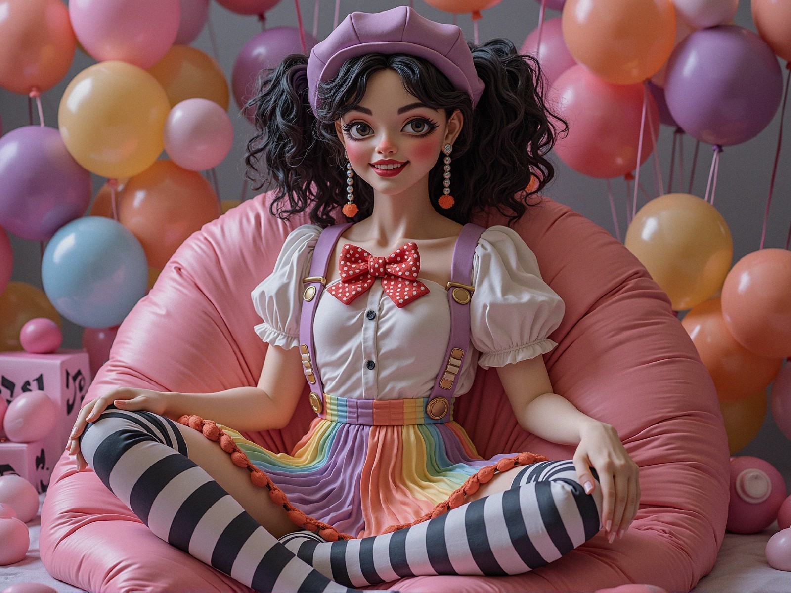 Prompt: An elaborate, full-body cake sculpture of a cheerful young woman with dark, curly hair styled in pigtails, sitting cross-legged on an enormous beanbag chair, smiling warmly. The sculpture is made entirely of fondant and buttercream, with realistic textures.