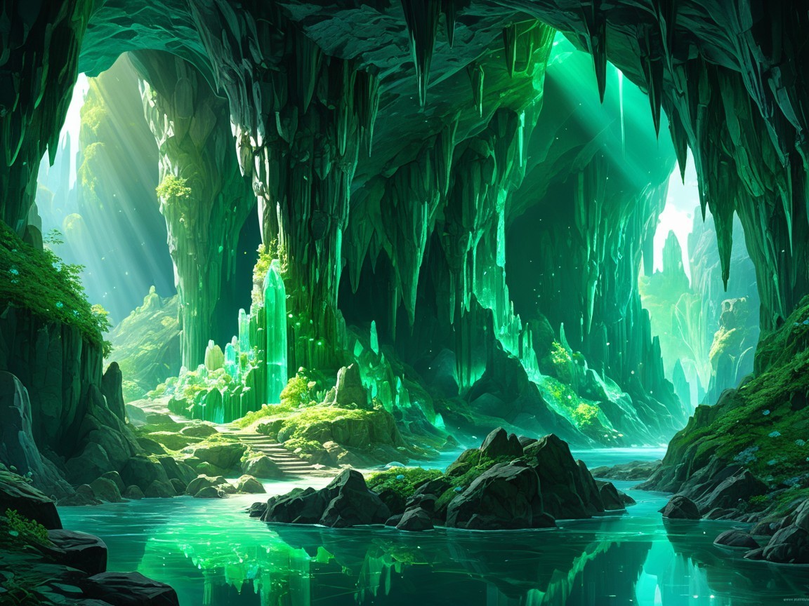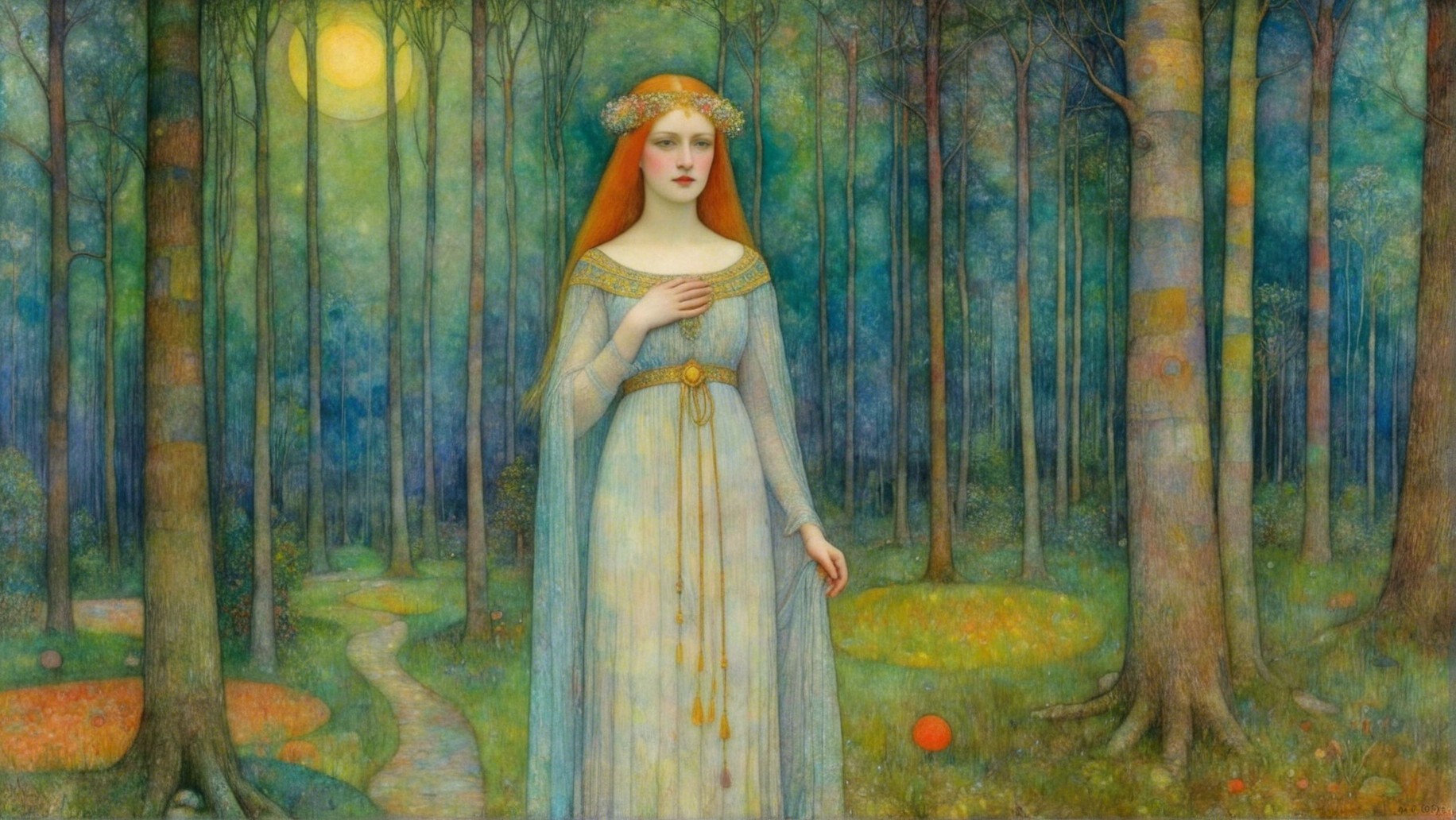 Vanaheim. Land of the Blessed. A great and beautiful sorceress of thirty years captivated by her natural magic in a magical forest hollow. The girl has the sophisticated, neat appearance of a heavenly goddess, her face is like a kiss, peaceful. She has blonde silky wavy hair braided in a bouffant braid. She wears a blue, pink and purple dress and an emerald ring on her middle finger. She just learned new amazing spells of matter transformation from her ancient magic book and is now trying them on magic crystals, at her marble magic table, round table decorated with carvings with spells, in a paradise of a magical forest, covered with a magical haze, the color of blue morpho. Her life is beautiful and harmonious.