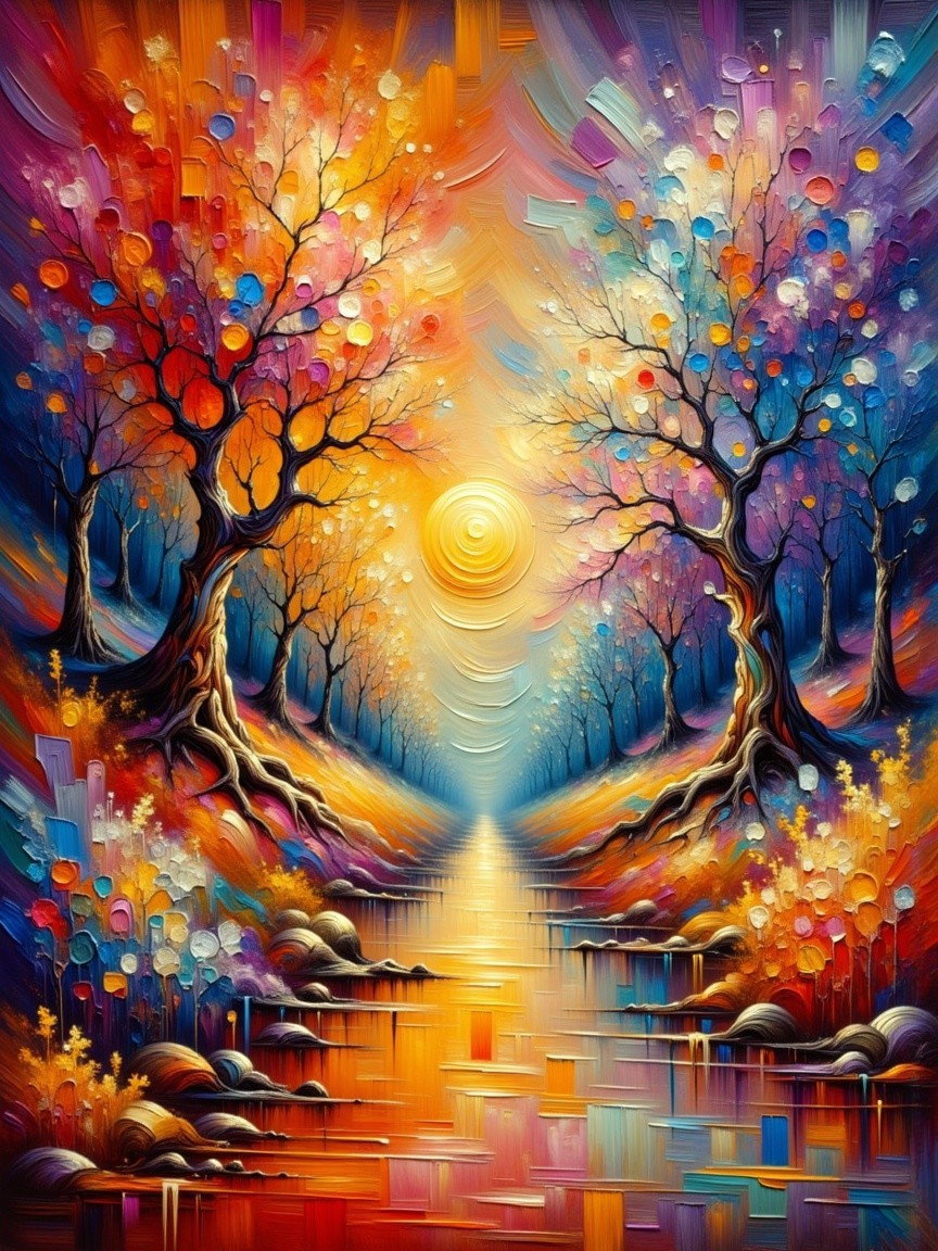 Prompt: Surrealism, "A mesmerizing digital painting in the style of Henri Rousseau and Horace Pippin, imbued with the ethereal qualities of Arkhip Kuindzhi and the stark lines of Ralph McQuarrie, showcases a surreal neon-lit apple tree against a pastel snowy landscape, evoking a gothic style and dreamlike setting. The tree's glowing fruit casts a magical glow upon the scene, highlighted by dramatic lighting and shadows that interplay with the silhouetted branches forming the outline of a singing bird, rendered in a grainy texture with dots and scratches reminiscent of Edgar Degas’ palette. Above, a winter night sky explodes with vibrant neon hues and swirling starlit clouds, blending blue, purple, and green in a breathtaking spectacle while maintaining warm shades of brown, beige, and cool grey-silver tones. Intricate details and a cozy atmosphere complete this elegant fantasy scene, whispering of exploration and wonder, enhanced with elements of Suprematism and bas-relief.".