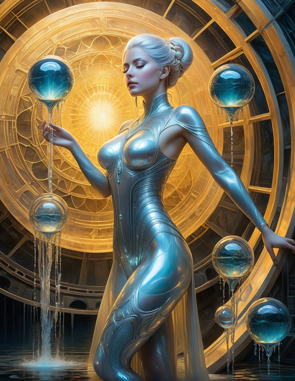 Prompt: Water Never forgets. Some of her memories are frozen, while other memories are fluid and always flowing. Beautiful sacred geometry underlies the composition of this image. Features a full pallet of pastel colors.