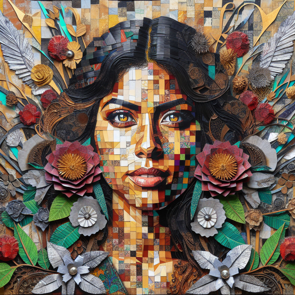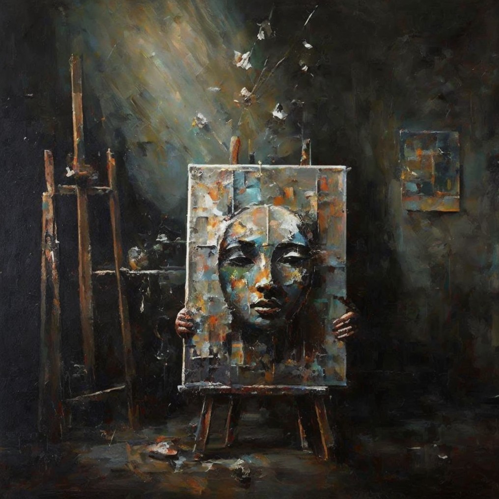 Prompt: full body view, the shape of a woman suggested by bright coloures of yellow, orange, pink, turquoise and blue with sharp edges, over a dark background of colours of black, dark purple, brown and gold, as an oil on canvas painting, fragmented art, palette knife art, layered textures