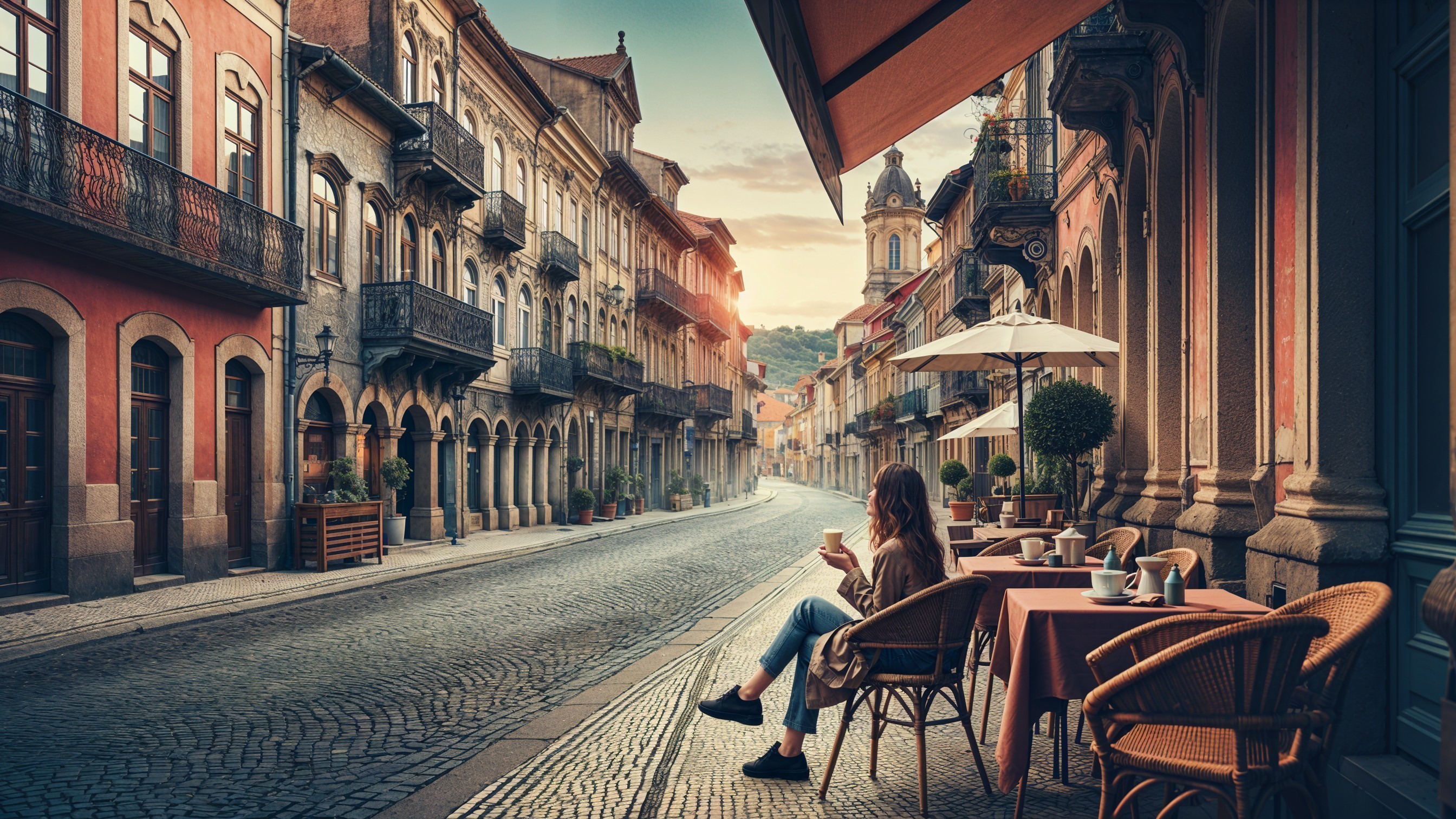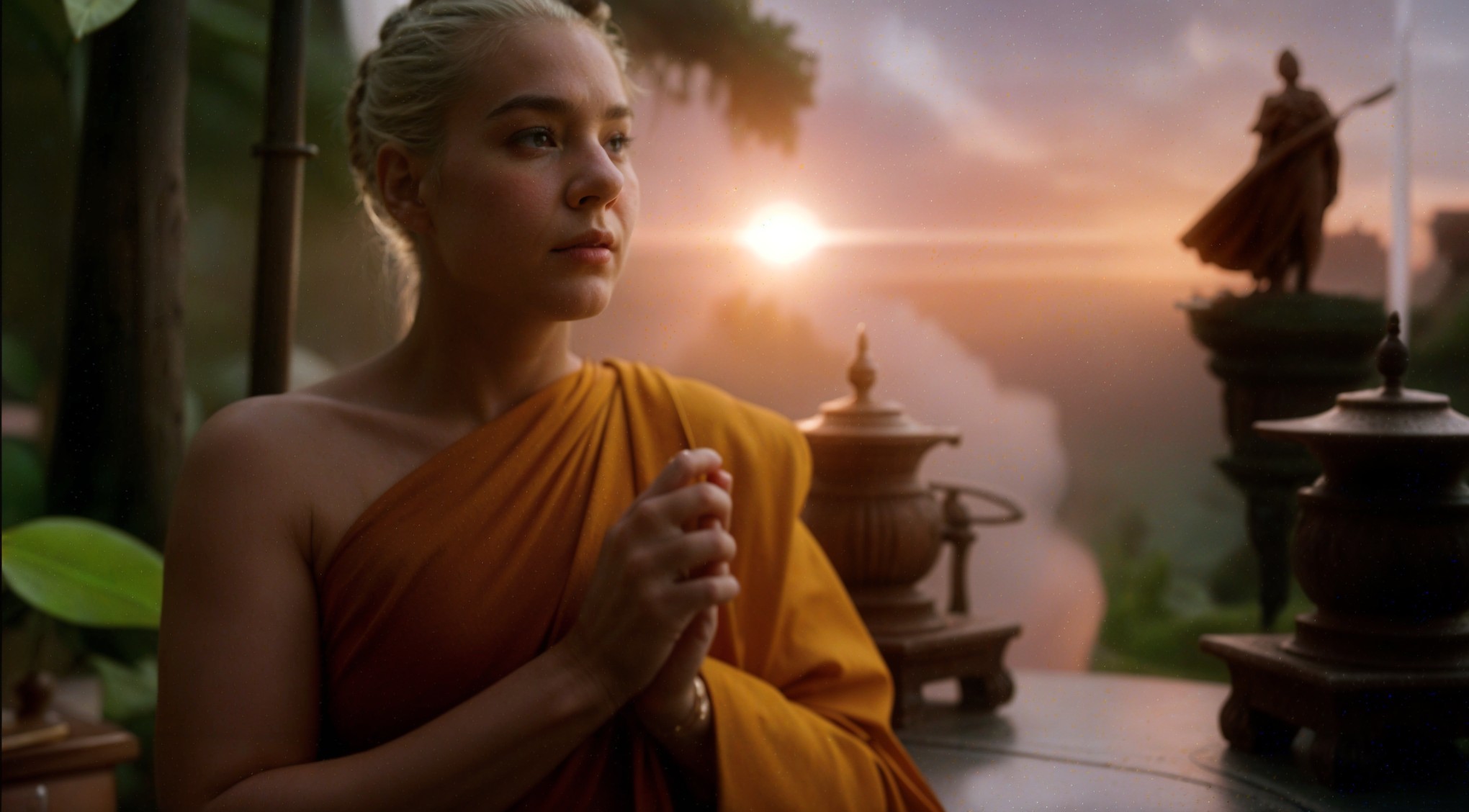 The woman herself is rendered with Friedrich’s spiritual austerity. Her clothing is simple, worn by the wind: a long, charcoal-gray garment (Pantone Cool Gray 11 C) that gathers at the waist and drapes down in somber folds. Her bare feet, pale against the dark stone, emphasize vulnerability and rootedness. Her hair — dark brown with strands lifted by the breeze (Pantone 7517 C with hints of Pantone 7533 C) — moves subtly, contrasting with the stillness of her body. Her expression is withdrawn, contemplative, eyes fixed on the vast, indistinct landscape before her.