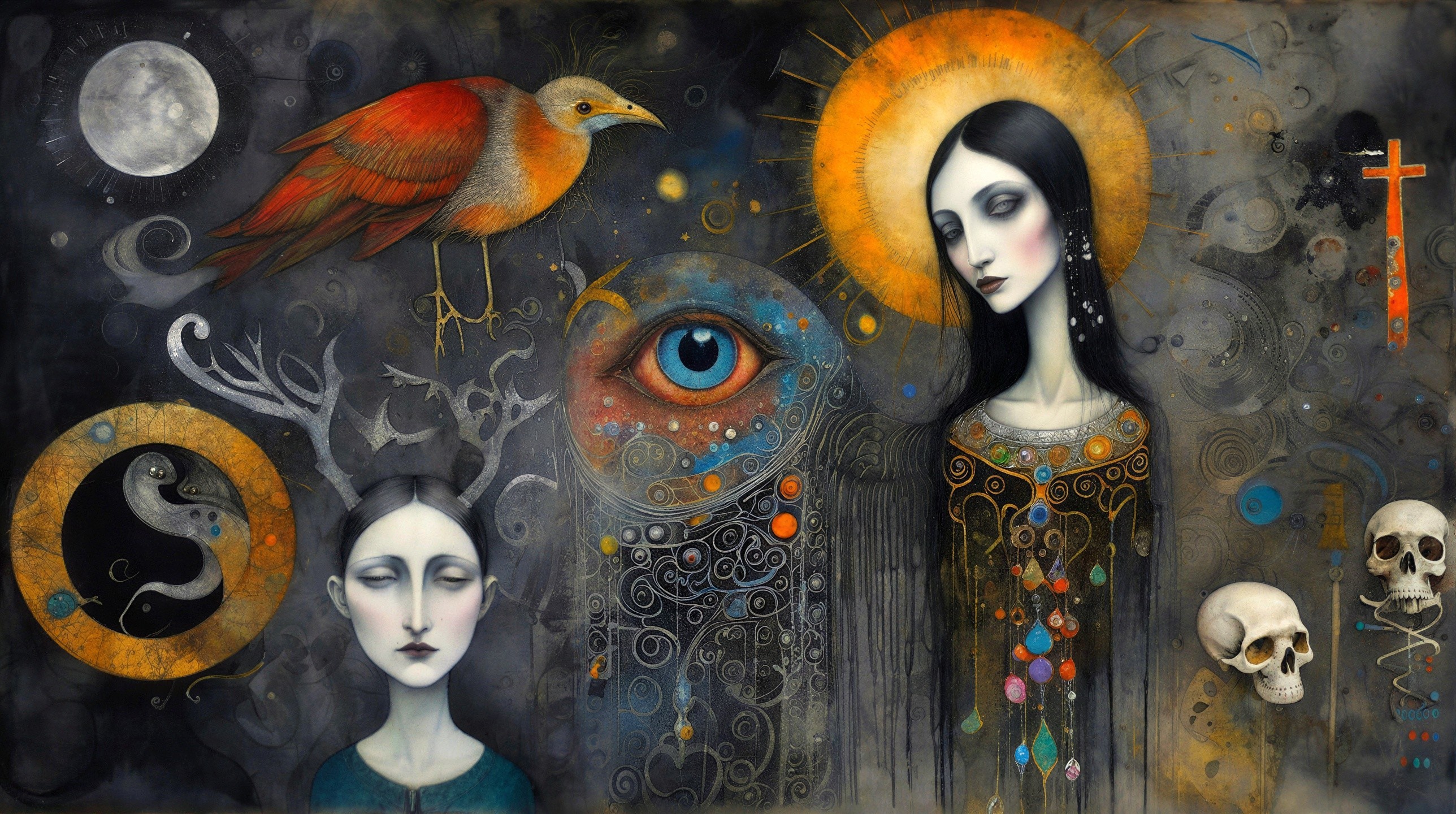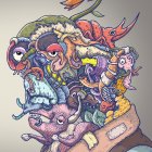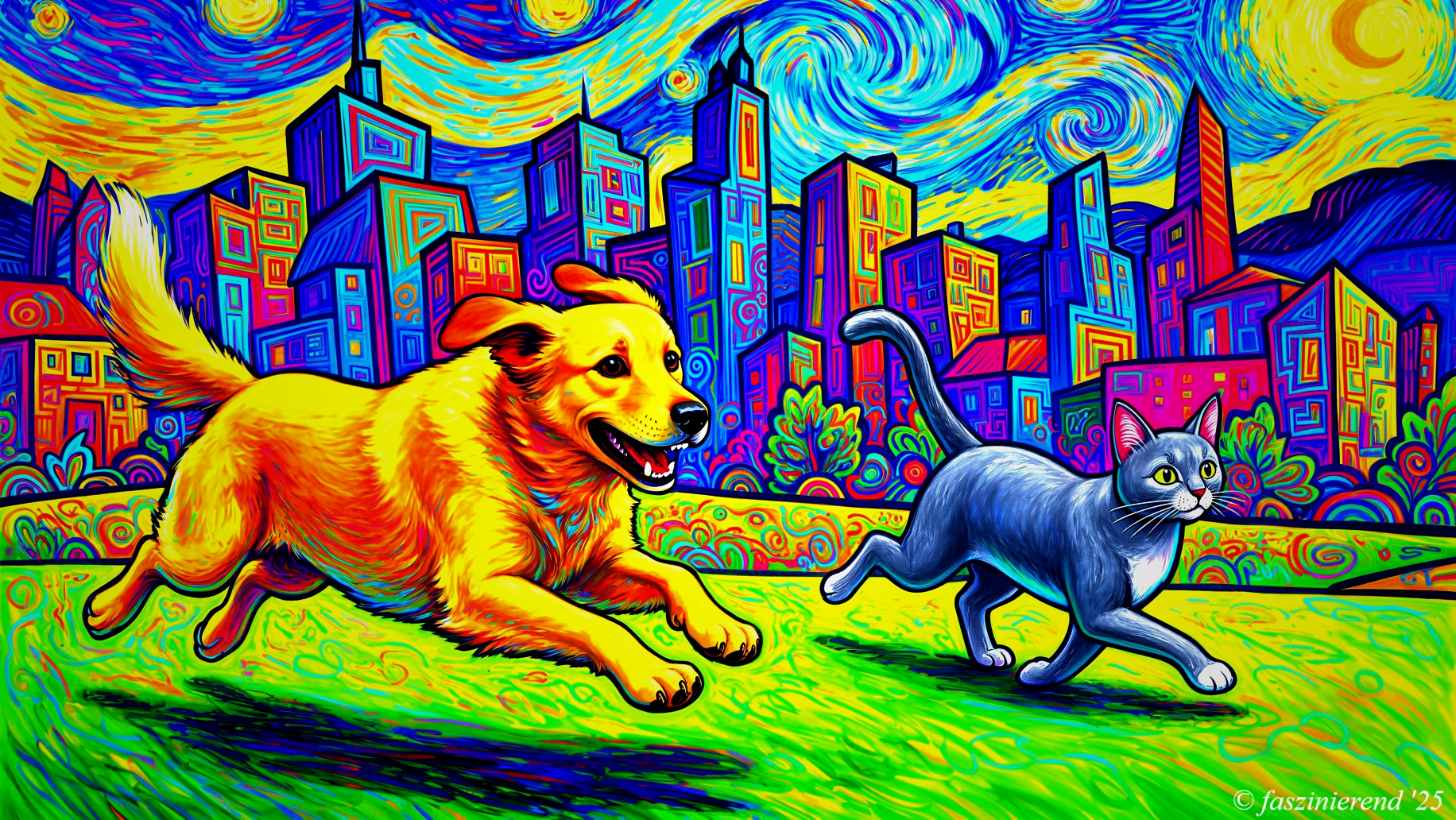Prompt: ((Masterpiece)), (((The artwork features vibrant, abstract figures resembling elongated cats, with geometric patterns in bright colors. The background is filled with swirling shapes, symbols, and playful elements))), By Hundertwasser, Hayao Miyazaki, Egon Schiele, Naoto Hattori and Rennie Macintosh, Josephine Wall, The piece should evoke a sense of wonder and awe, utilizing techniques reminiscent of colorful pencil sketch and watercolor painting. Full Size image.