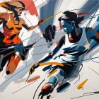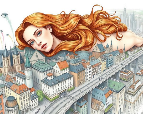 Prompt: An abstract city skyline with tall urban buildings painted in expressive brushstrokes. Warm oranges and dark reds contrast with cool blues and grays, creating a moody, atmospheric cityscape. A dark blurred bridge arches across the foreground, reflected softly below, blurred bicyclists on the bridge. Painterly texture, layered colors, slightly distressed canvas look, modern abstract art style, emotional and dramatic mood. Textured oil on canvas,artistic brushwork, abstract expressionism.Avoid photorealistic, avoid sharp edges, avoid smooth gradients