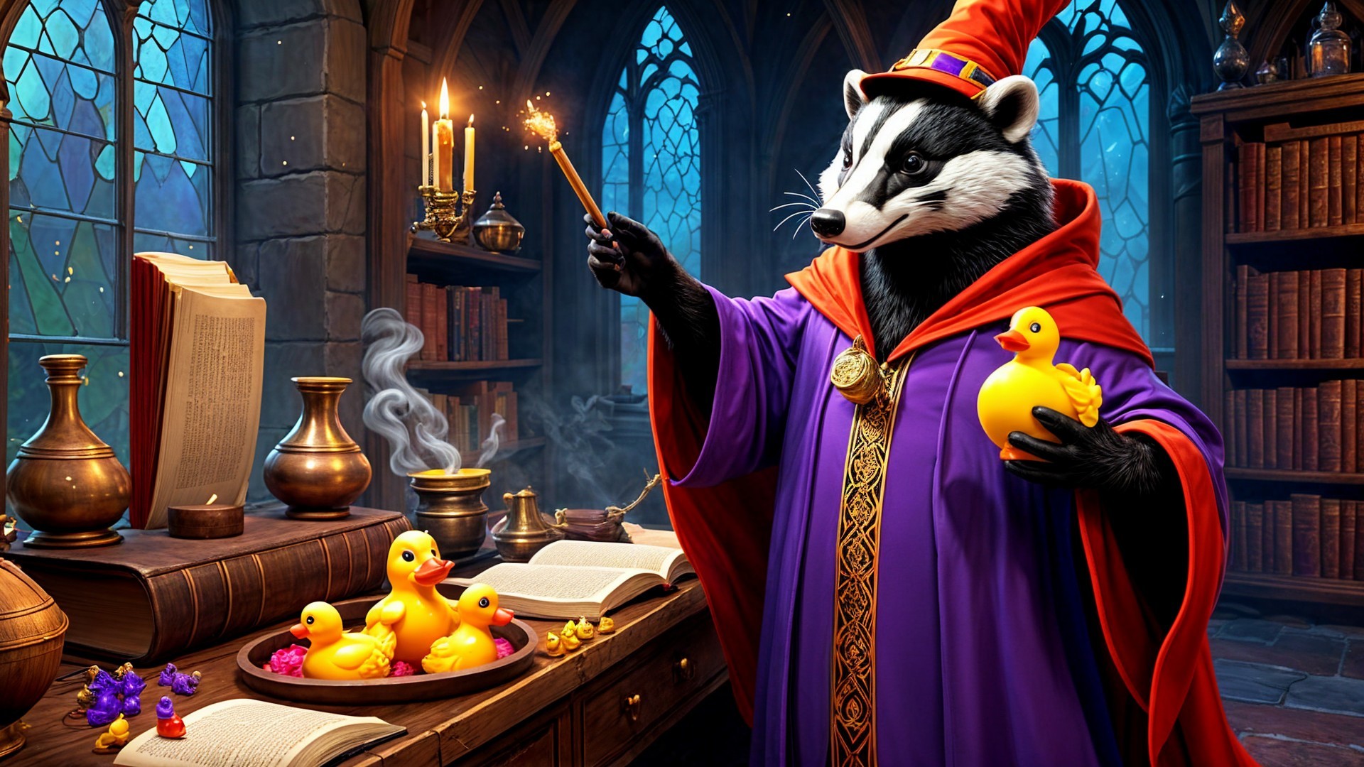 Prompt: A beautiful purple-haired woman wearing a long purple velvet ankle-length dress with flouncy sleeves and purple suede high heels. She is pointing to one of a row of identical bunny rabbit toys.