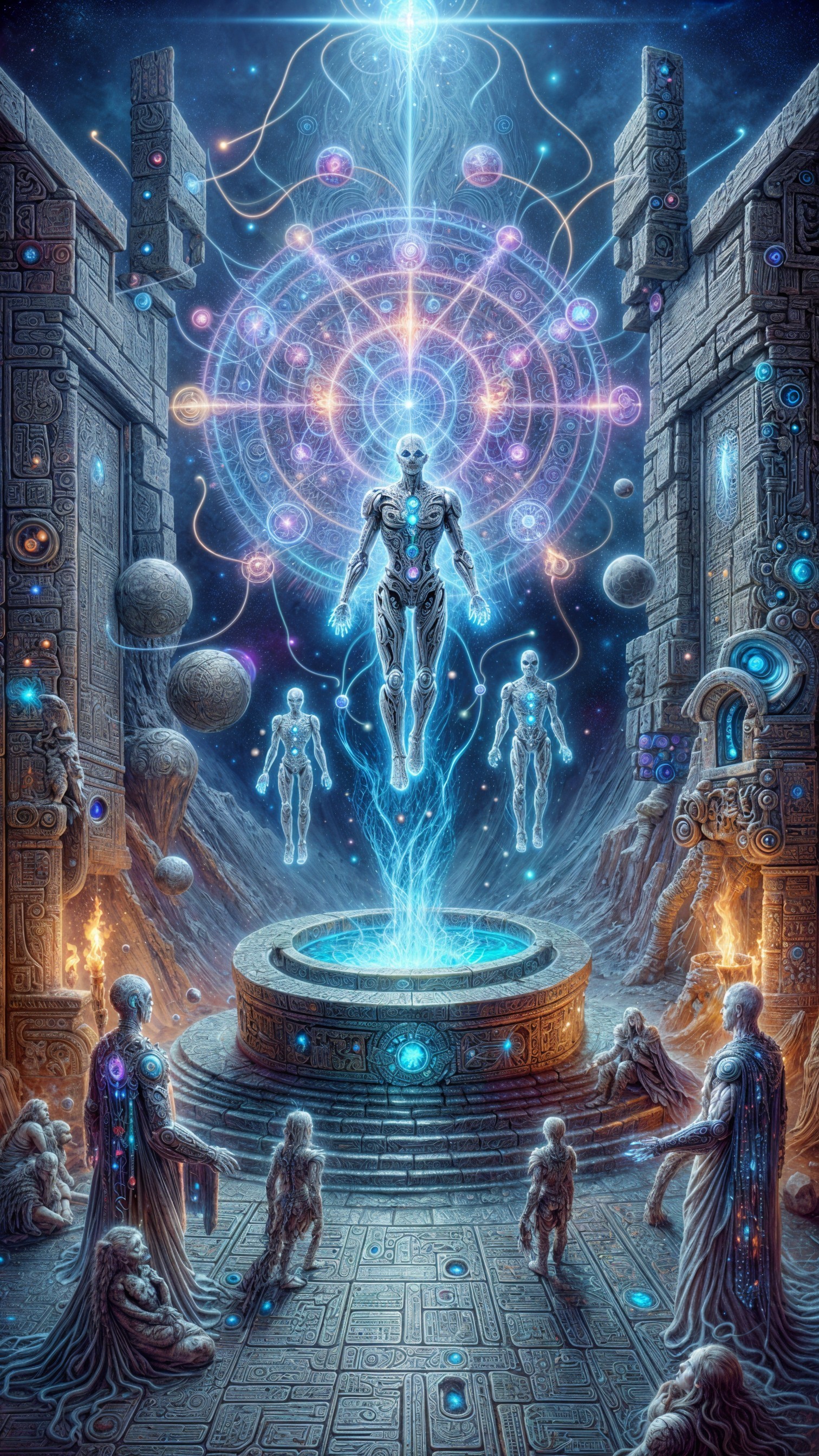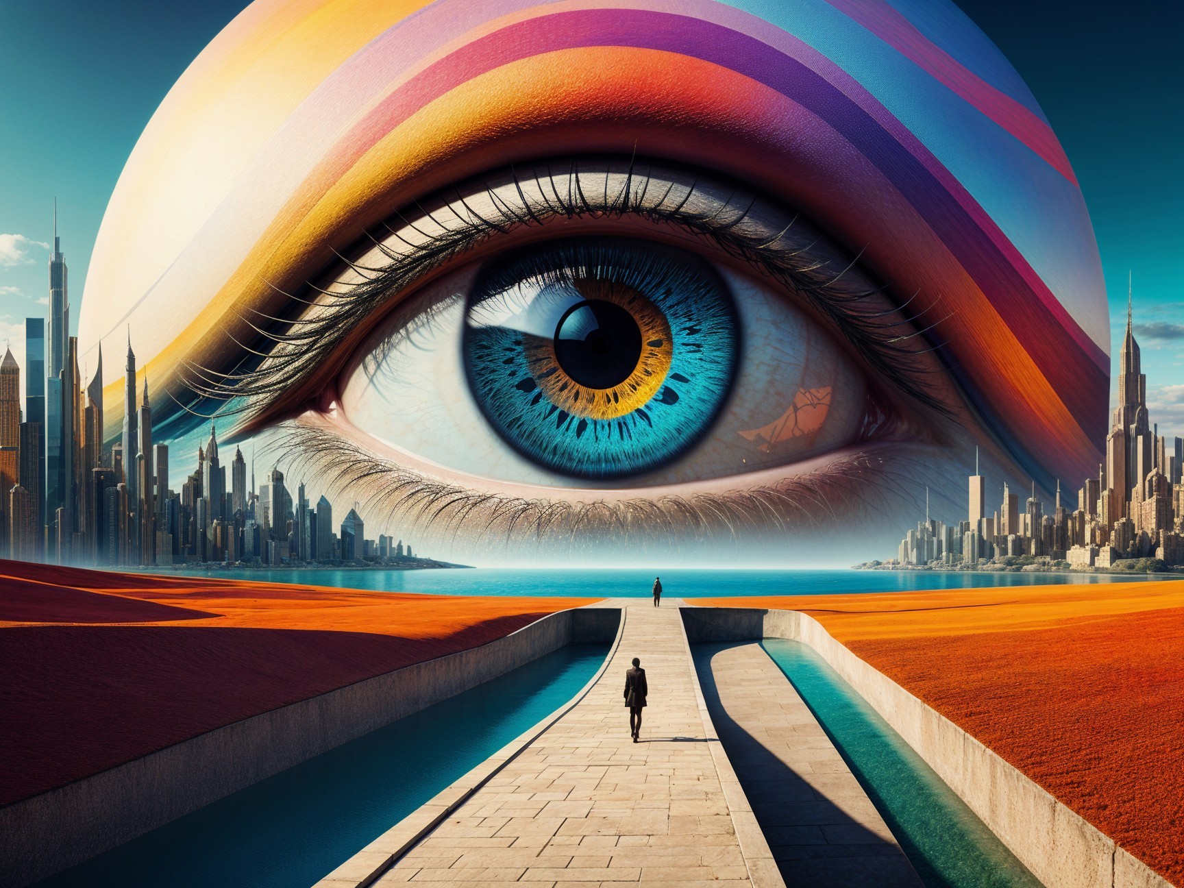 Prompt: ((A colorful panoramic masterpiece)), ((Amine style, Anime Style. A surreal landscape painting depicts a human face emerging from water, in the center of the frame. The face has smooth, light brown skin, closed eyes, and a serene expression, suggesting a meditative state. Above the face, a cloudscape of structures, including domed buildings, arched bridges, and floating saucer-shaped objects, forms the hair. The buildings are a mix of light gray and earthy tones, contrasting with the blue sky. The face is framed by two large, circular openings that give a view to sky and more of the cloudscape. The setting appears to be a beach with brown sand, rocky formations, and a sea with blue water. The water surrounds the face up to the neck. The perspective is from a medium distance, focusing on the details of the face and the fantastical environment above. The overall style is dreamlike, with vibrant colors and a touch of fantasy. The lighting seems soft, giving a tranquil ambiance. Hyperrealistic style. Pastel and oil painting), By Joan Miró, Beksinski, Tomasz Setowski, Jacek Yerka, Amanda Clark, Aubrey Beardsley, Josephine Wall. Full Size, Full Length and Full Scale Image.