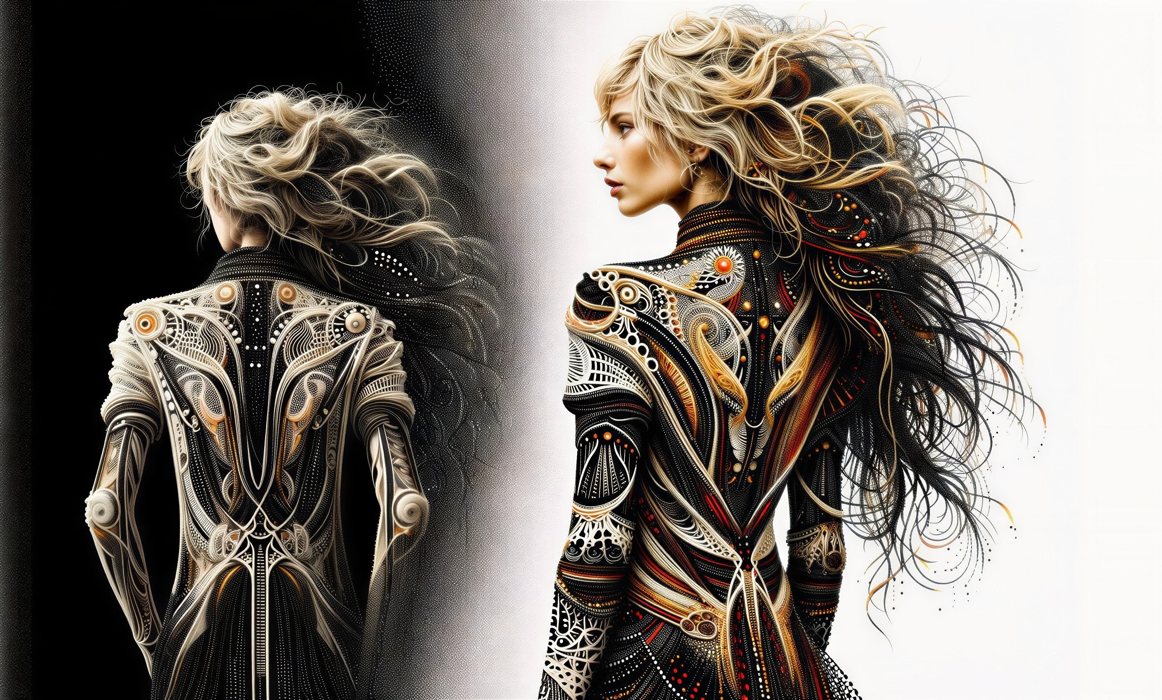 Prompt: A resemblance of realism in predominantly vibrant shades of blacks, whites and yellows with and red, with pointist pin fine misty wispy dots patterns. A set of cracked canvas using technique.The figure is front facing from the viewer, looking over her the side left shoulder which reveals her side profile. She has light-toned skin and an elegant, slender body shape. Her wild wispy flowing hair is visible her head is adorned with an intricate fine pinpointed techniques covering her hair entirely. The figure's torso is partially uncovered covered by a similarly patterned, body-hugging garment or body art that traces along her shoulders, arms, and curves of her body in an exotic, lace-like fashion. The garment almost seems to merge with her skin around her bare skinned waistline, creating a symbiotic and seamless appearance. The composition centers on the striking contrast of the detailed, dynamic beautiful textures of the white, red and black against the softness of the figure's skin and the simplistic contrasting textures of the subject in the image the background whites minimal reminiscent in style of Aubrey Beardsley