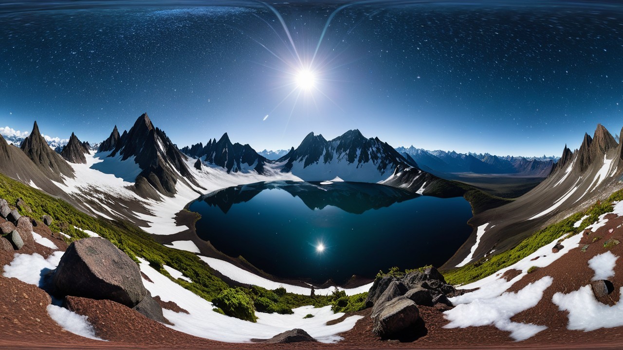 Prompt: Create Fish Eye Lens Photograph Of A vibrant Image of an alien soil and bio luminescent Giant vegetation landscape filled with towering jagged snow covered peaks and realistic colors. A large, textured planet looms in the background, surrounded by a dark starry space background, Photo realistic, Vivid Colors, Ultra HD-Resolution, Fish eye Lens Effect, polar (coordinates effect:1.7)(Warped Landscape bended at right angle perspective:1.7) Realistic Vivid Colors, (Time Lapsed Image:1.5)( Perspective Bent Effect:1.8) (Milky Way Arch:1,3)
