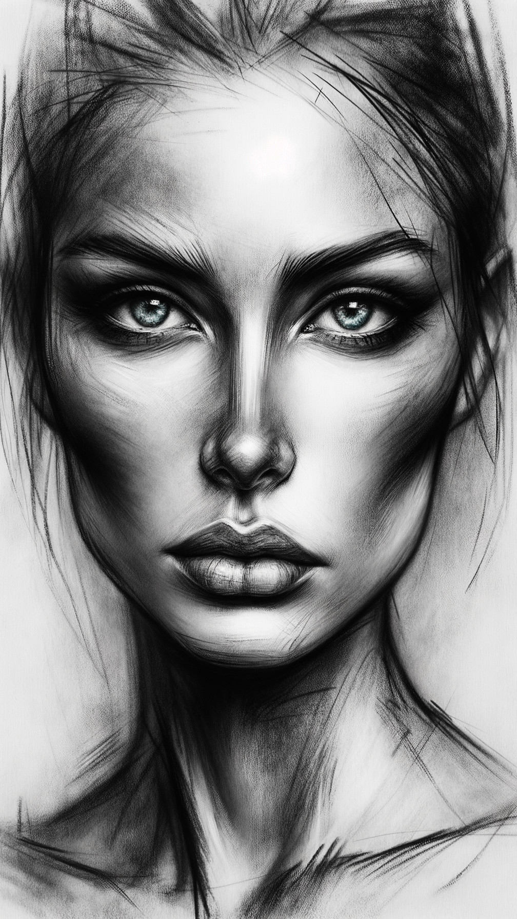 Prompt: An artistic charcoal sketch of a woman's silhouette in a long dress, on a moonlit night at the beach with her two husky dogs. Paper and charcoal (black and white) - lots of perspective, focus on the moon, reflections that evoke poetry, detailed ocean waves, stars dotting the sky. (the woman walks away...)