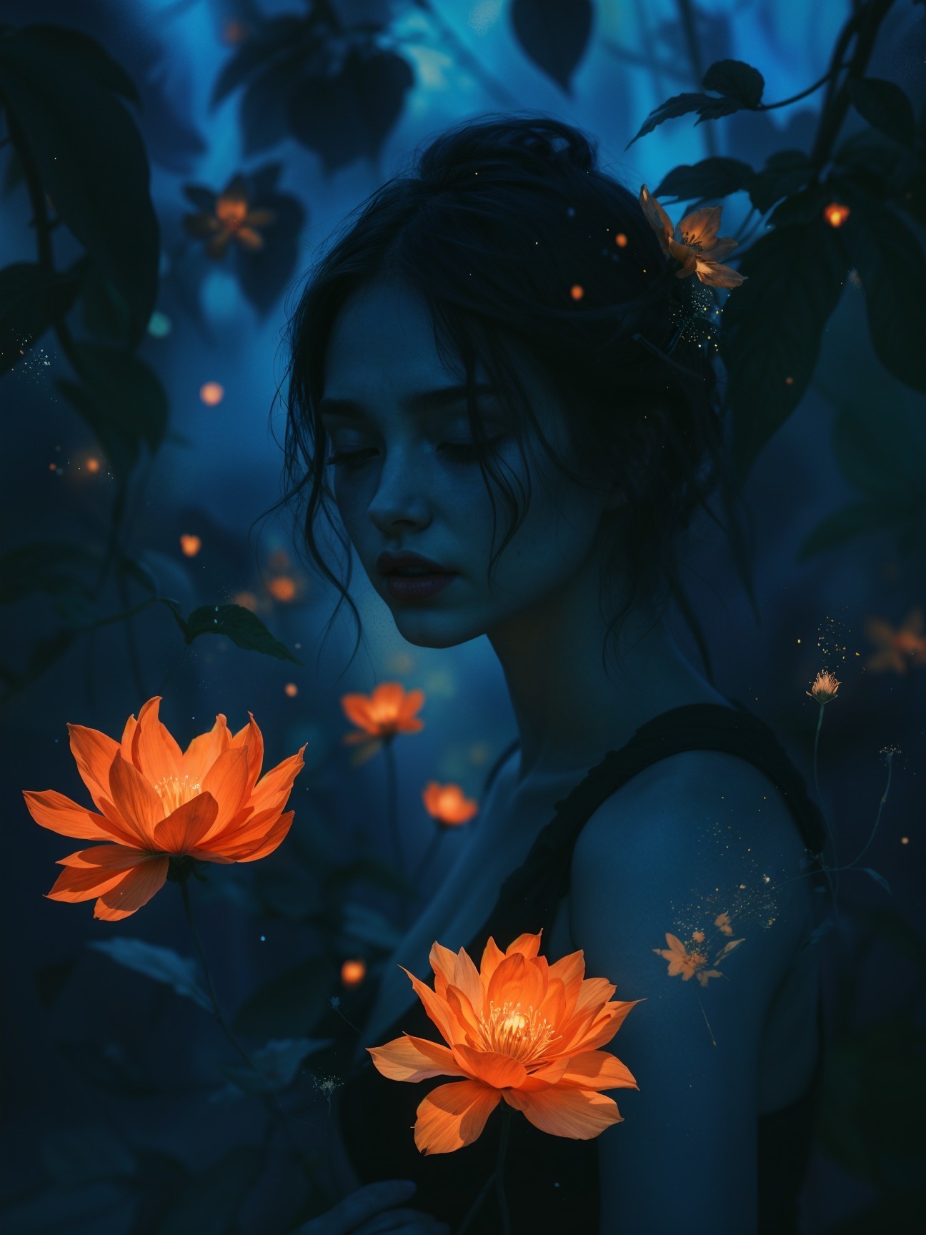 Prompt: Echoflower” She blooms in the dark where the streetlights fail, painted in the colours that night can’t name. Her pulse is a quiet rebellion, trembling pale, a lantern caught in its own flame. I touch her shadow just to feel her speak, soft as thunder rolling under my skin. She carries storms in the curve of her cheek, and mercy in the places where I break thin. If she stays, the sky bends closer to hear; if she leaves, the world forgets its spine. Either way, I walk her echo without fear; some hauntings are holy, and this one is mine. Aspect ratio: 3:5 - tall, intimate, the kind of frame that feels like someone stepping toward you. It gives the generator room to breathe along the body line without losing the face. Lighting mood: Subtle bioluminescent glow; soft light rising from within, not cast from outside. Like the subject is lit by her own pulse. Palette base: Ultramarine + ember orange, with thin threads of silver. High contrast, high emotional charge. The kind of colors that argue and then make up.