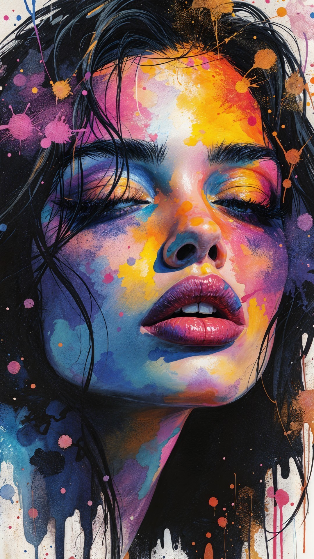 Prompt: (((Masterpiece))) A dynamic ink and watercolor drawing in a scratching, splashing, blotting appeal, irregular stroke, squiggly line, evocative, combined with impasto drip painting, splatter, overspray of color, painted and drawn on black canvas. sensual and very emotional image.