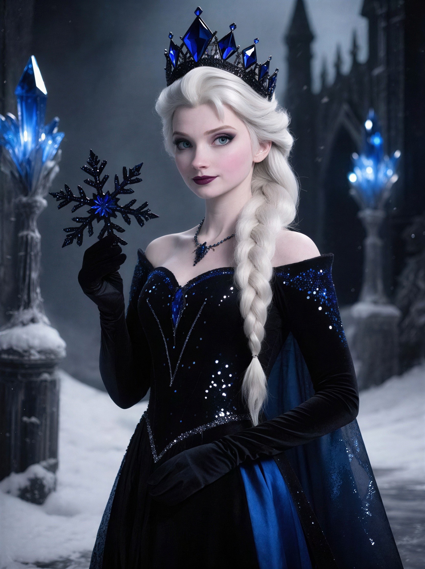 Prompt: A very dark gothic gorgeous Elsa from frozen evil queen with long platinum braided hair off on one side wearing a gothic black blue diamond crown and wearing the most gorgeous sparkly glitterly dark gothic style black and blue dress with matching gloves holding a dark obsidian blackish blue snowflake in a dark gothic obsidian black and blue crystal castle with obsidian crystal lights with grey ash as snow