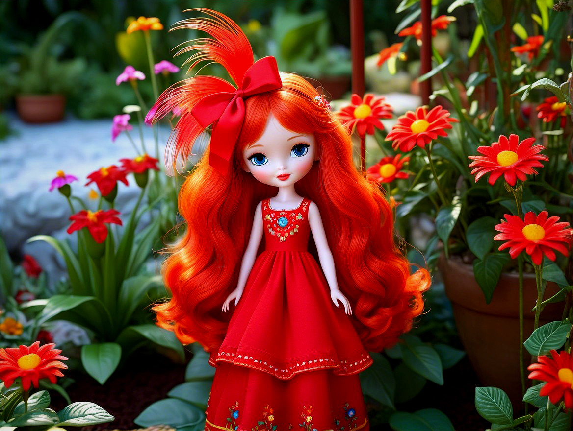 A serene young woman in a vibrant, flowing dress stands amidst blooming flowers