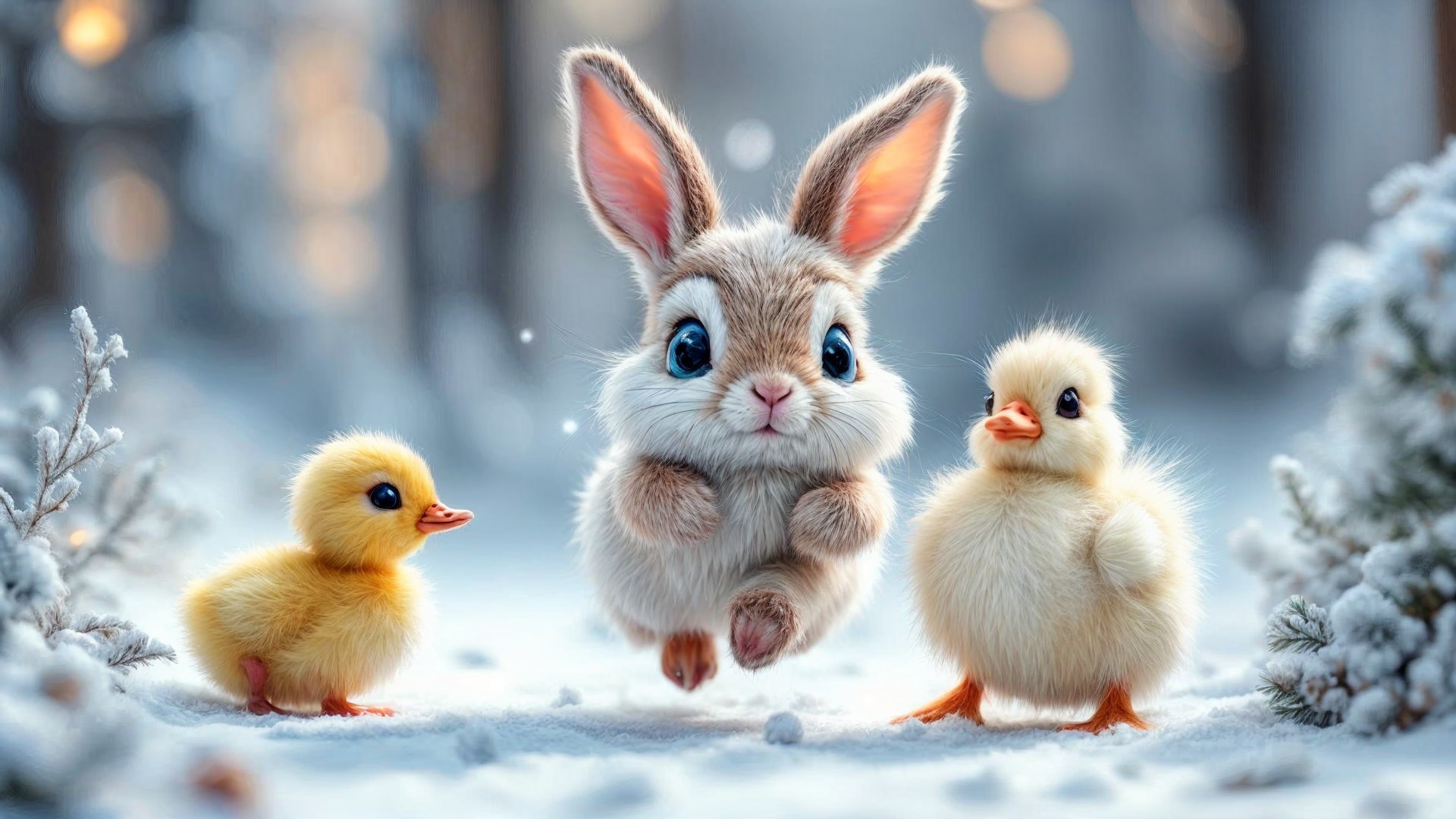 Whimsical Bunny and Ducklings in Snow