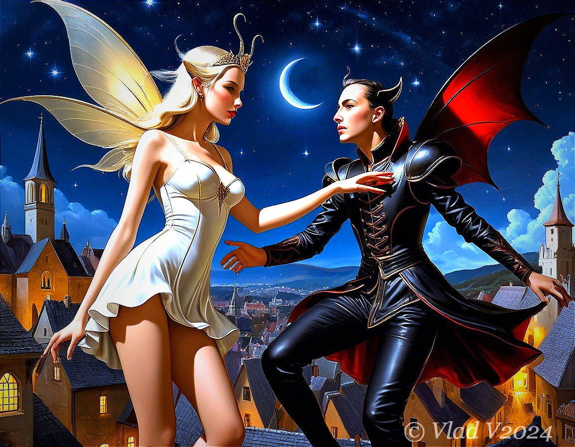 Fairy and Wolf Under the Moonlit Pond